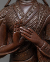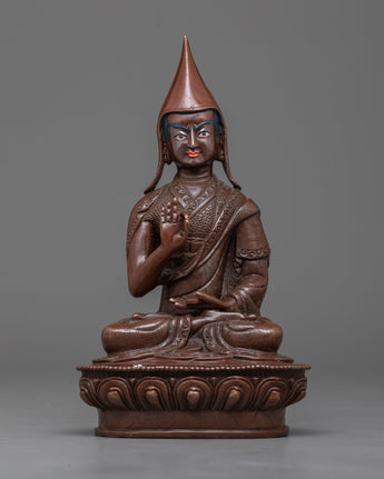 This handmade statue depicts the renowned Buddhist master Copper Tsongkhapa surrounded by his loyal disciples, Je Gyaltsab and Je Khendrup. Crafted with precision and care, this statue exudes grace and elegance, making it a perfect addition to any spiritual or cultural setting. It is a beautiful representation of devotion and enlightenment.