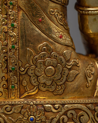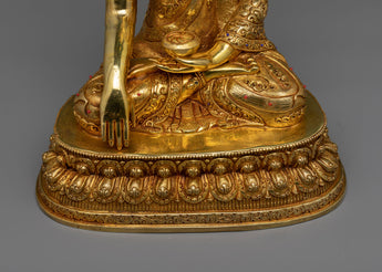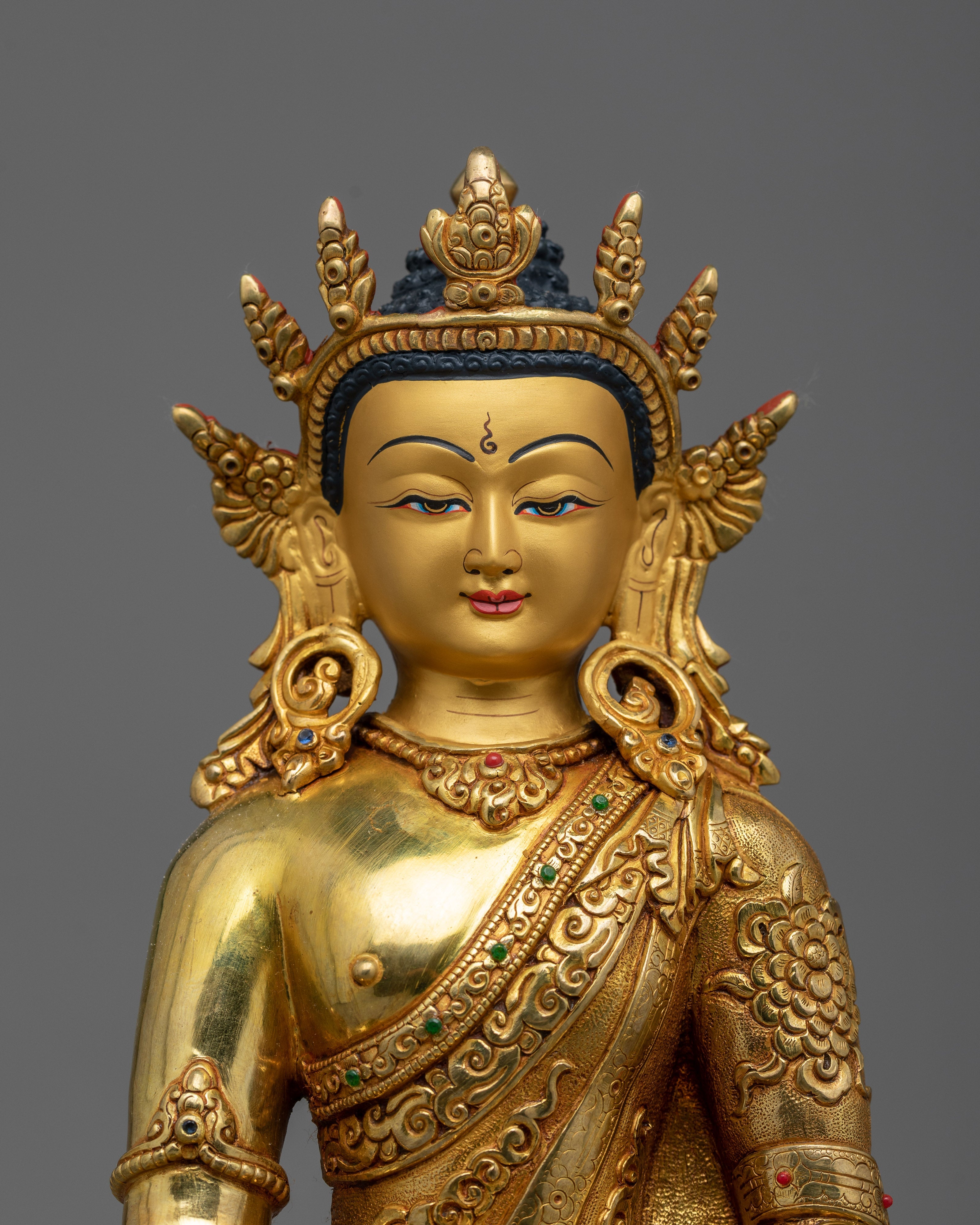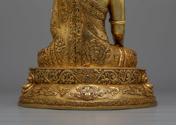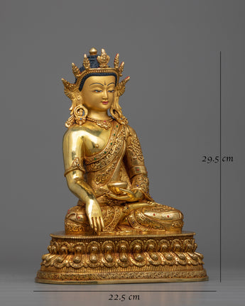 With the help of the Crown Shakyamuni Buddha Gold Gilded Statue, a representation of inner calm and spiritual awakening, enter the realm of divine enlightenment. This statue, which was carefully constructed with every detail in mind, is a symbol of wisdom and calm. With its outstanding appearance and height of 11.6 inches and weight of 2.84 kg, it is sure to draw attention. Crafted from copper and embellished with 24K gold plating, it emanates a sense of antiquated knowledge and empathy. Set it up in your sacred area and let its energy to lead you to enlightenment.