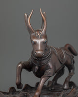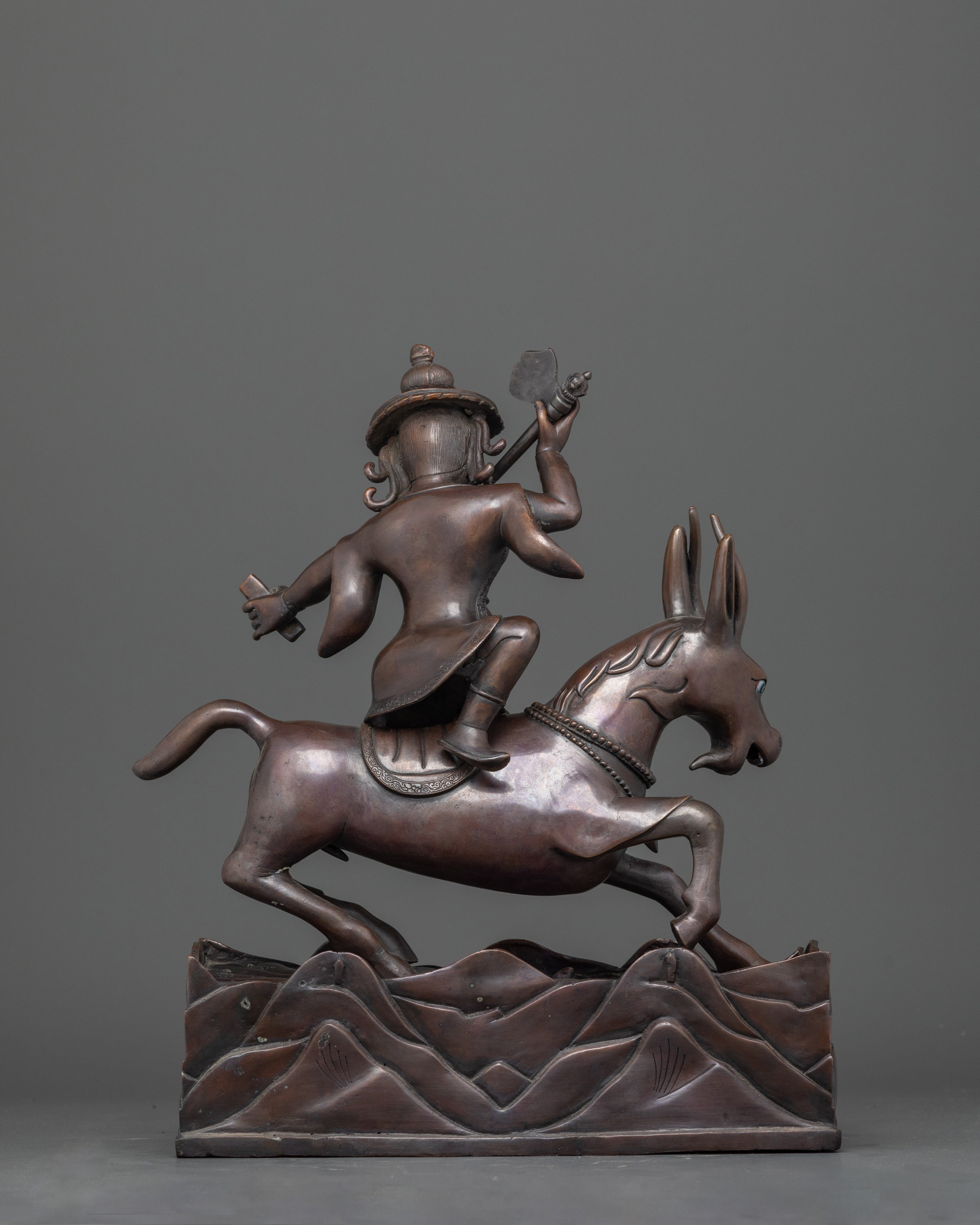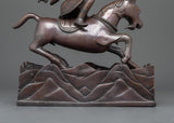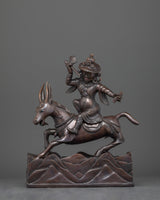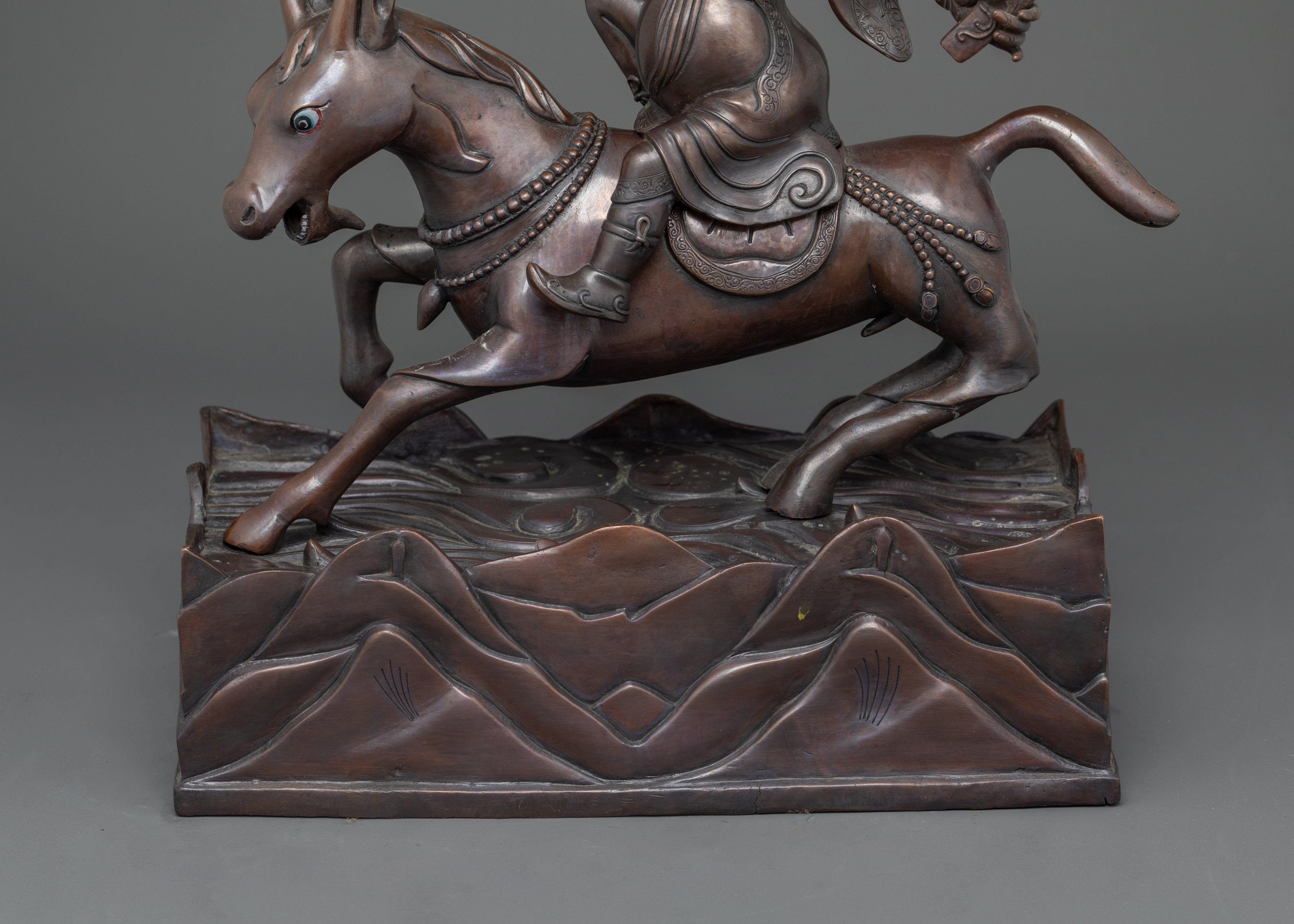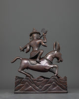 Damchen Garwa Nagpo is a fierce Tibetan protector deity who is frequently shown riding a goat and carrying a hammer. He is well-known for his dedication to preserving the Dharma's teachings, and practitioners commonly summon him for protection against obstacles and negative forces. This oxidized copper statue depicts his unwavering vitality and creates a strong spiritual connection in your home.