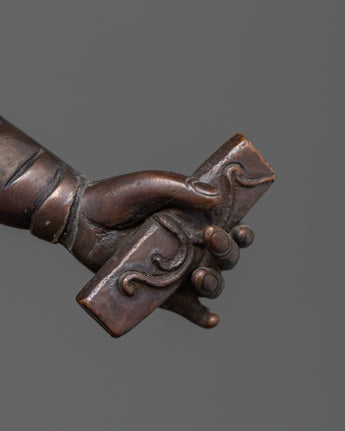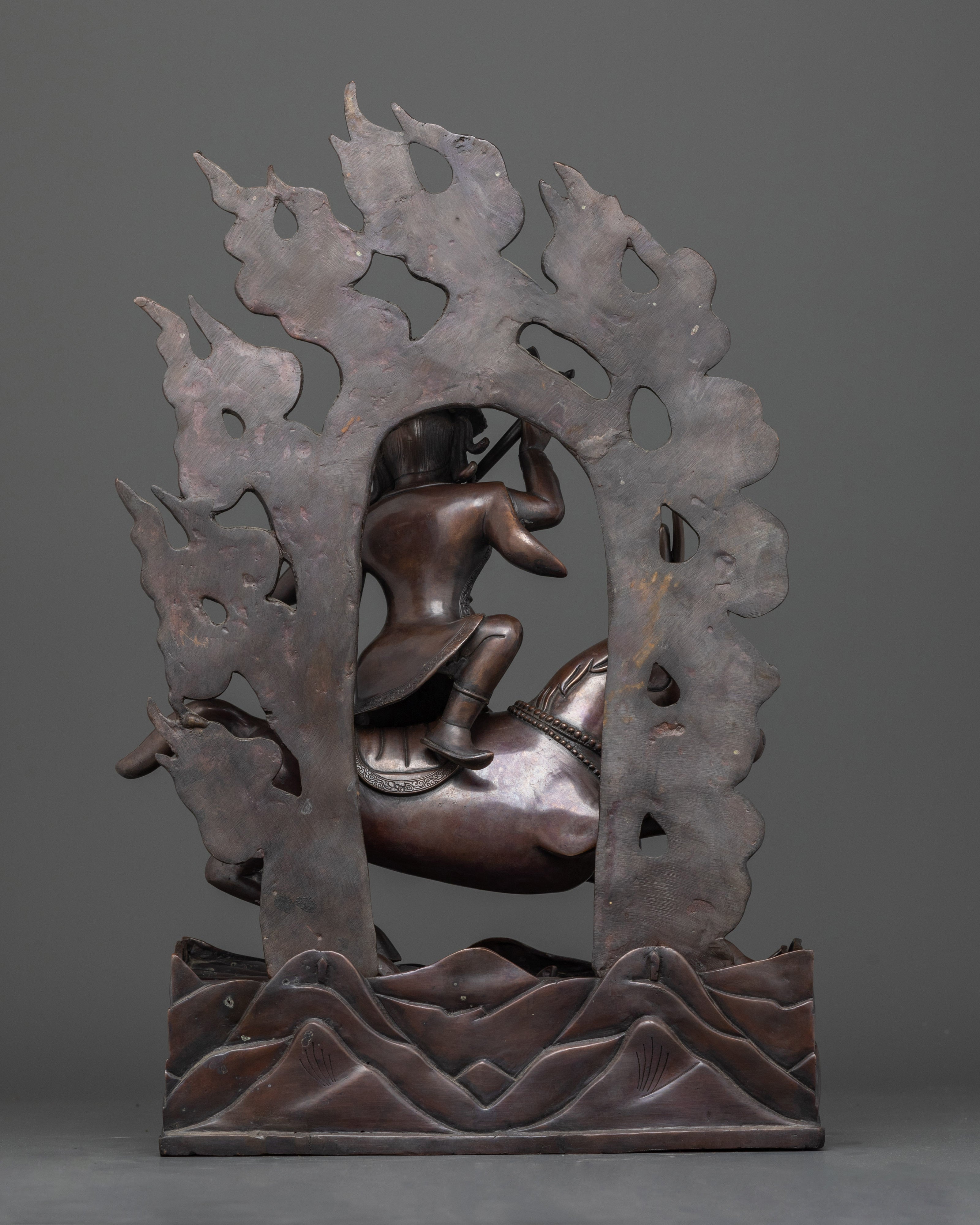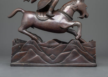 Damchen Garwa Nagpo, or the "Blacksmith of the Dharma," is a strong protective deity in Tibetan Buddhism. This monument represents his powerful, forceful form, representing his constant protection of practitioners and their spiritual paths. The oxidized copper body highlights his commanding presence, making this an important piece for any shrine or religious location.
