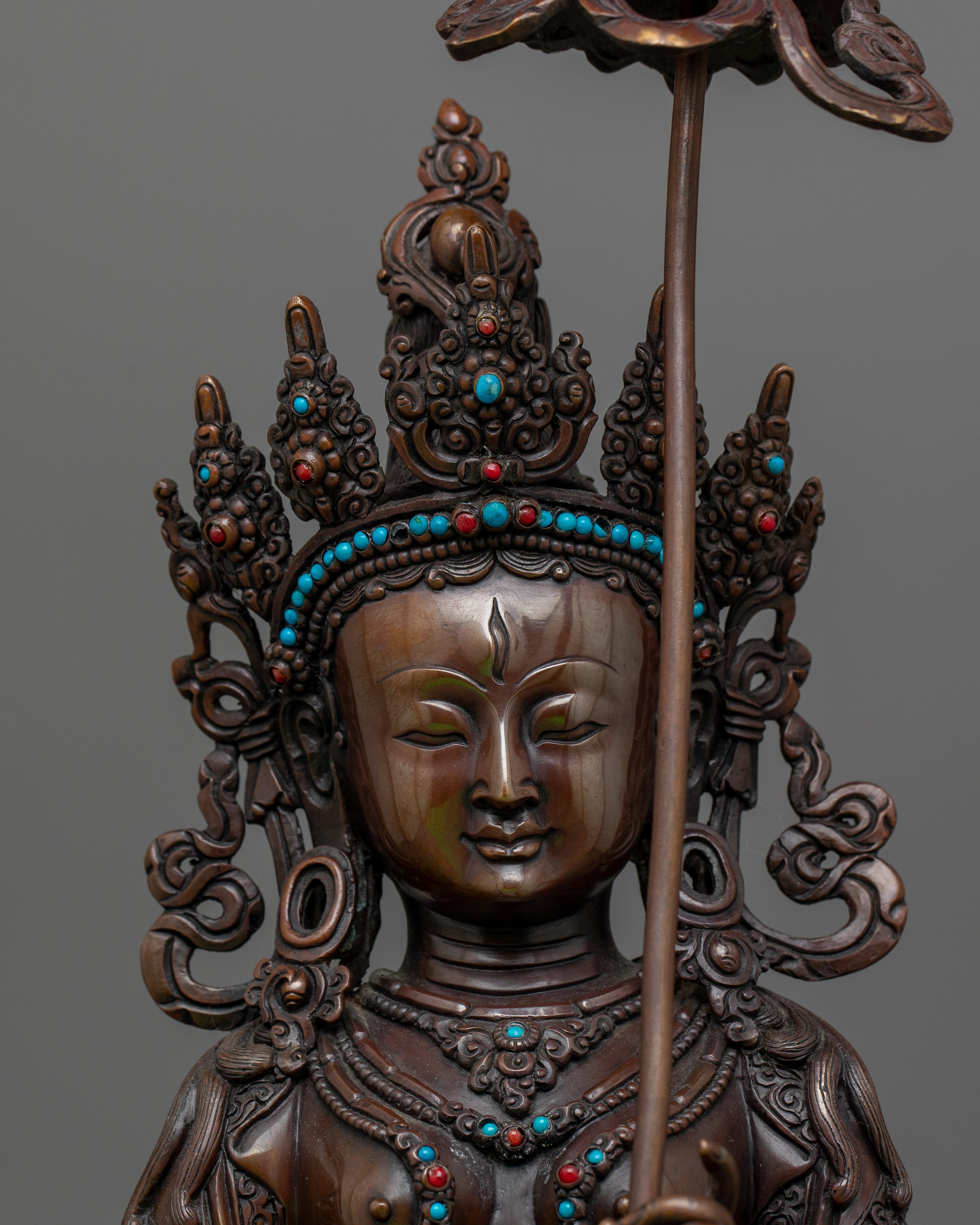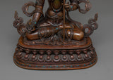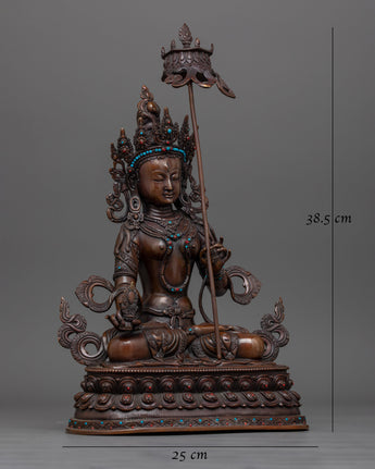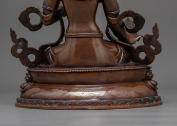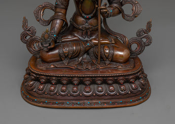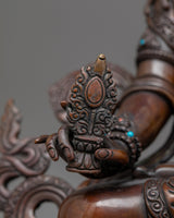 This superb statue has a timeless, one-of-a-kind darkened aspect due to its skillfully crafted oxidized copper body. The imbedded gemstones provide depth and brightness to the artwork, enhancing the fine details of Dukar's expression and the elaborate decorations on her attire. Its substantial presence and weight of 3.57 kg make it perfect for any area used for spiritual development, meditation, or introspection.