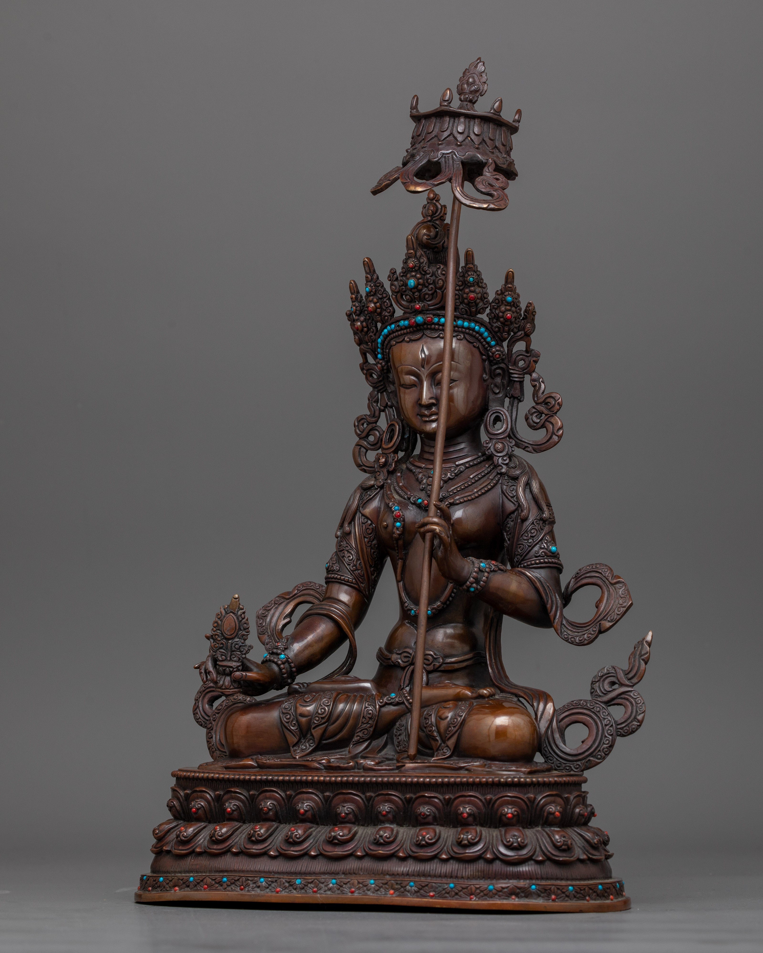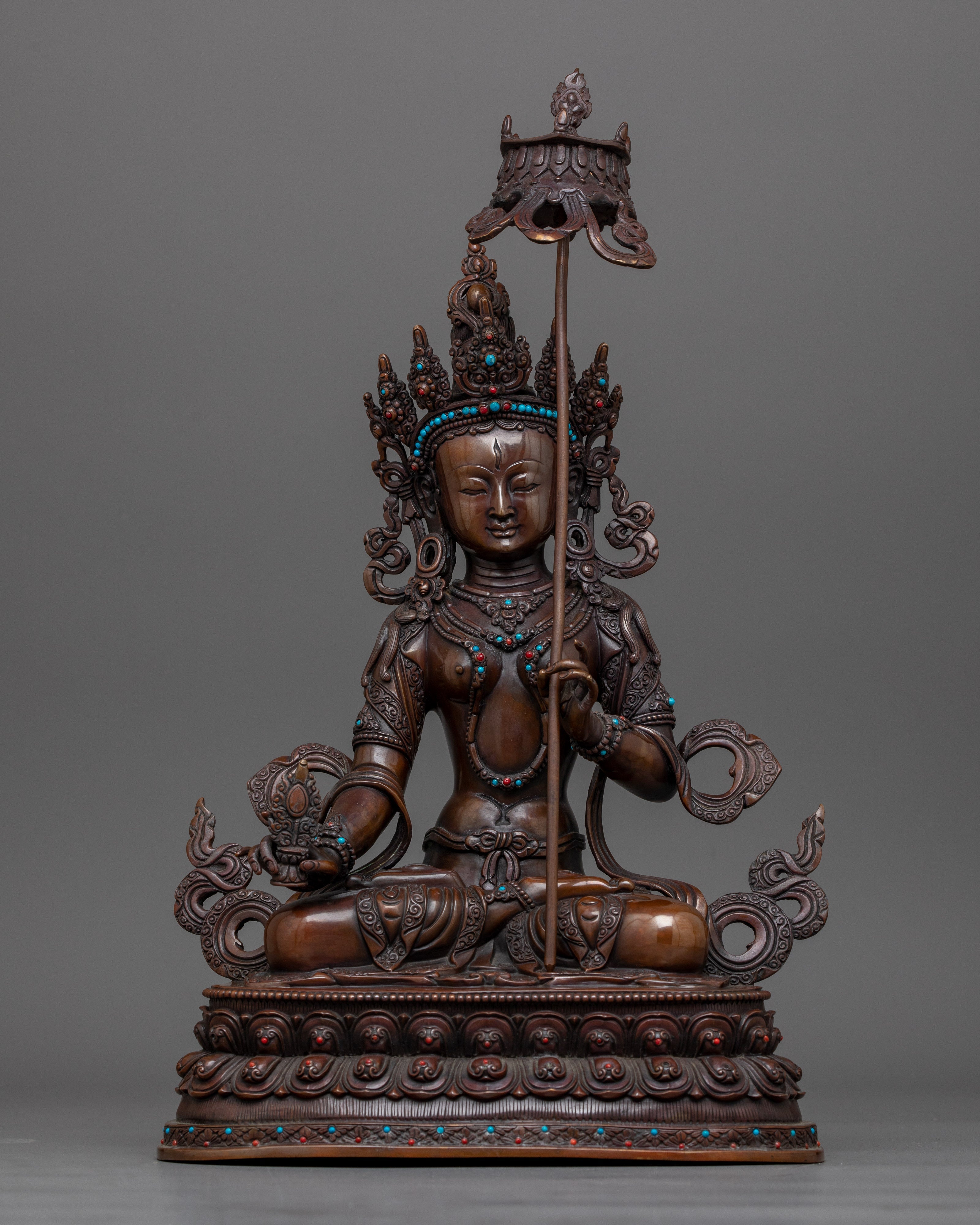 Dukar, also known as Sitatapatra or the White Umbrella Deity, is a significant figure in Buddhism, representing protection and cleansing. With her two arms, she holds the Dharma wheel and a priceless jewel, symbolizing her capacity to protect practitioners and guide them to enlightenment. Dukar's presence is especially sought after due to her protection against negative energies and her ability to bring about peace and harmony.