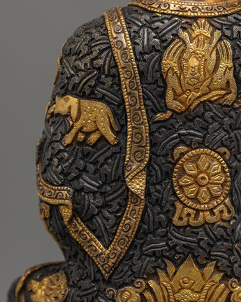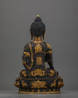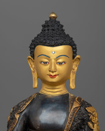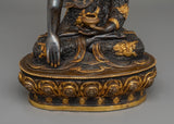 The deeply crafted Shakyamuni Buddha statue is made up of oxidized copper and has amazing craftsmanship. The 24K gold gilding and gold and acrylic paintings highlight the fine carvings, emphasizing the Buddha's serene look, seated posture, and beautiful hand mudras. The mild oxidation on the copper lends the piece a timeless quality.