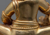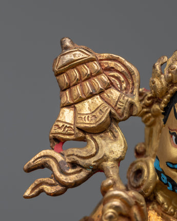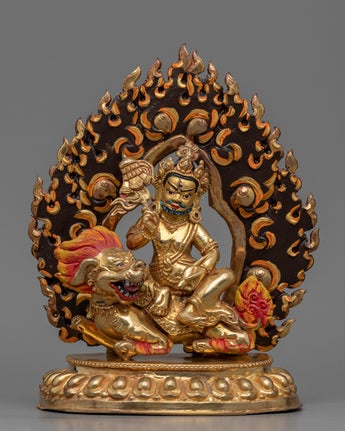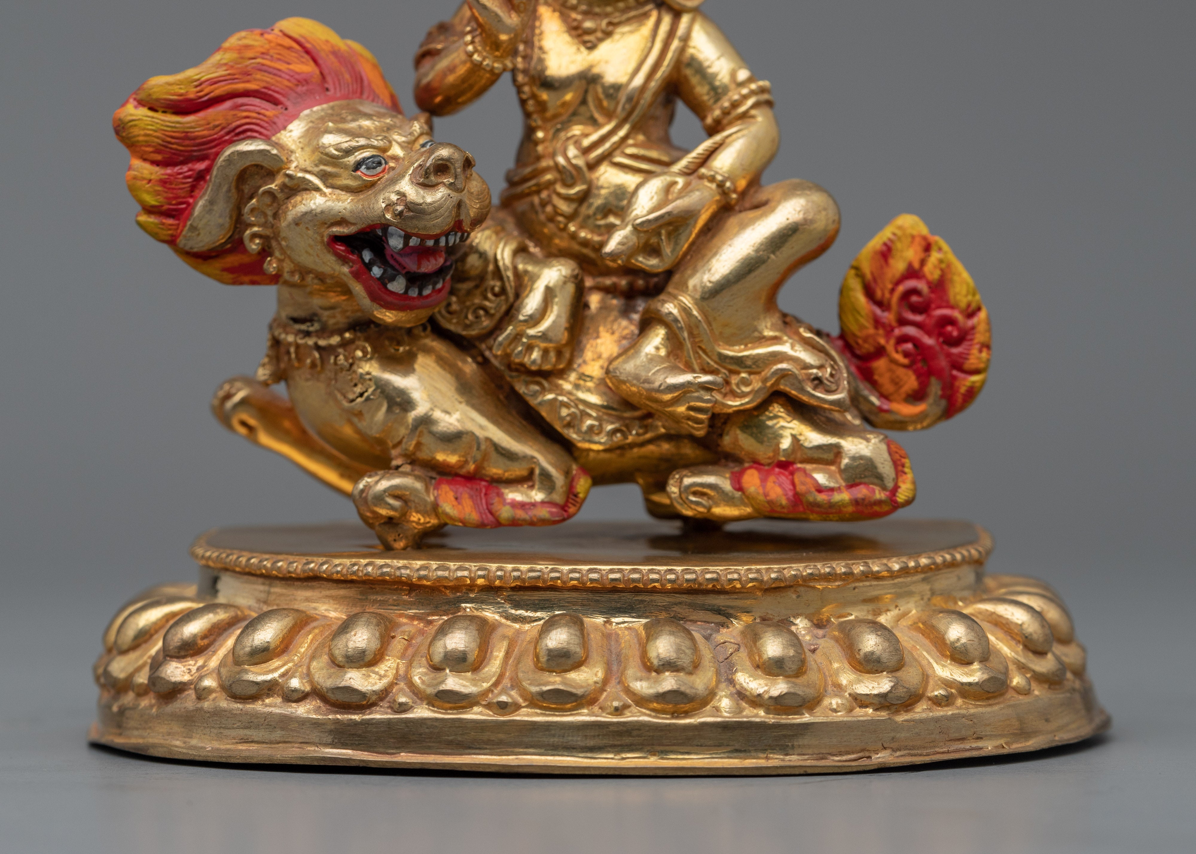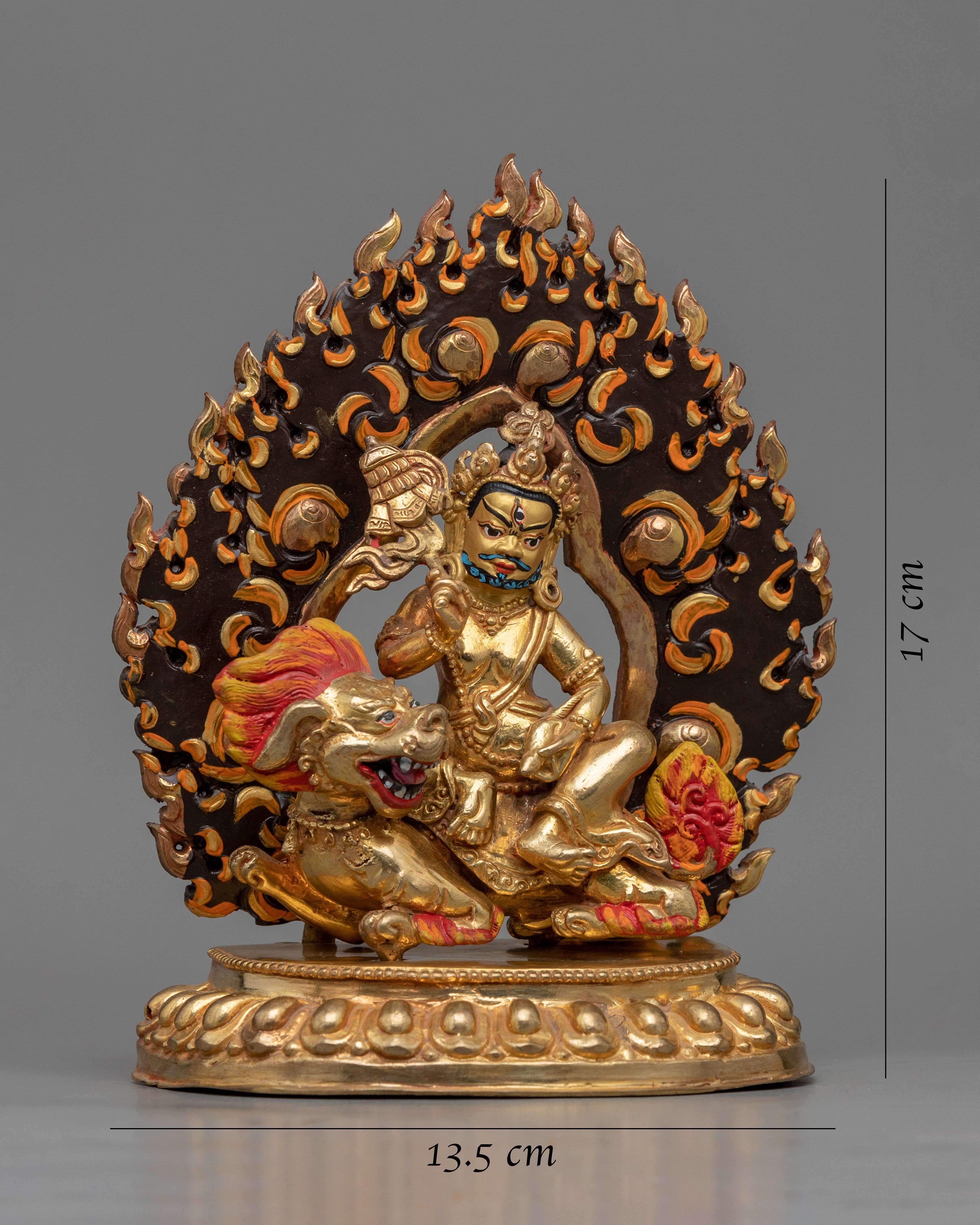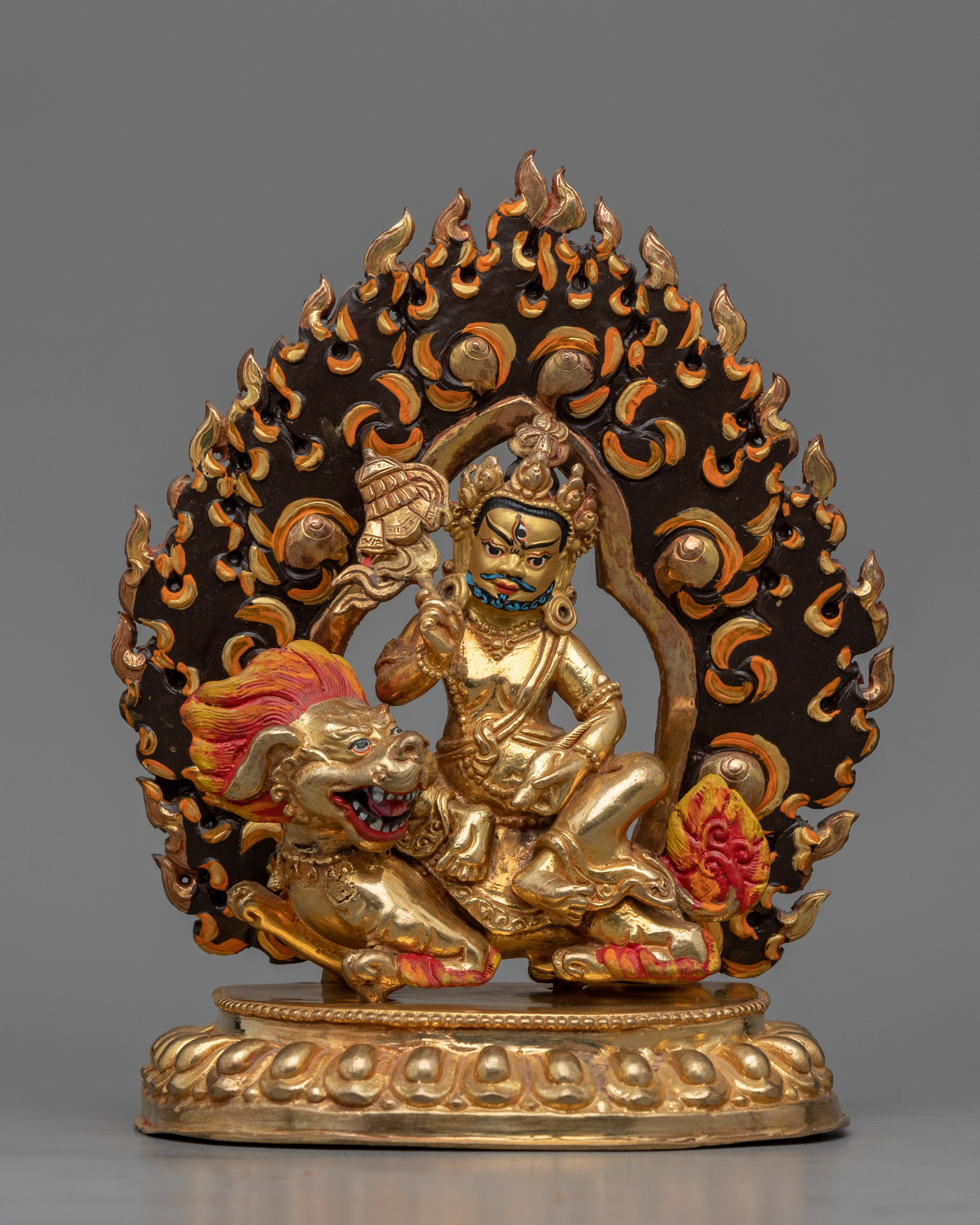 This magnificent Namtoshe, Deity of Wealth statue is a stunning work of art, hand-carved using the traditional Himalayan technique. The statue is carved out of fine copper and gilded with gold. Here, Namtoshe, also known as Dzambhala, is depicted regally riding a lion representing his ability to conquer obstacles and protect his devotees from harm. He can be seen carrying the parasol in his right hand and a mongoose in his left hand. as he is surrounded by a blazing halo.