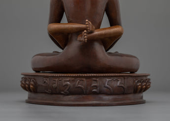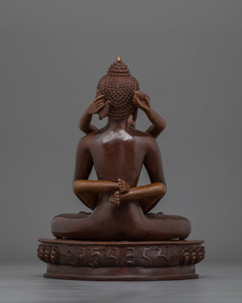 This statue of Oxidized Samantabhadra with Consort is a representation of the Vajrayana Buddhist concept of sacred unity. With a height of 8.7 inches (22 cm), a base width of 6.7 inches (17 cm), and a weight of 2.26 kg, this finely carved figure is designed to evoke a strong sense of connection to the Tantric ideas.