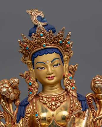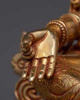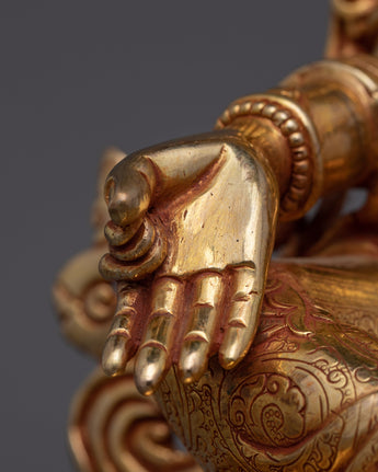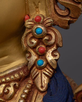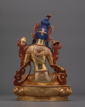 The Dharma Protector Shyamatara (Green Tara) Sculpture, is revered as a bodhisattva who grants freedom from fear, aids in overcoming obstacles, and guides practitioners toward enlightenment. This statue stands at a height of 10.6 inches (27 cm) with a base width of 7.7 inches (19.5 cm). Crafted from a copper body, the statue is adorned with 24K gold gilding and enhanced by detailed gold and acrylic paintings, showcasing the divine elegance of Green Tara.