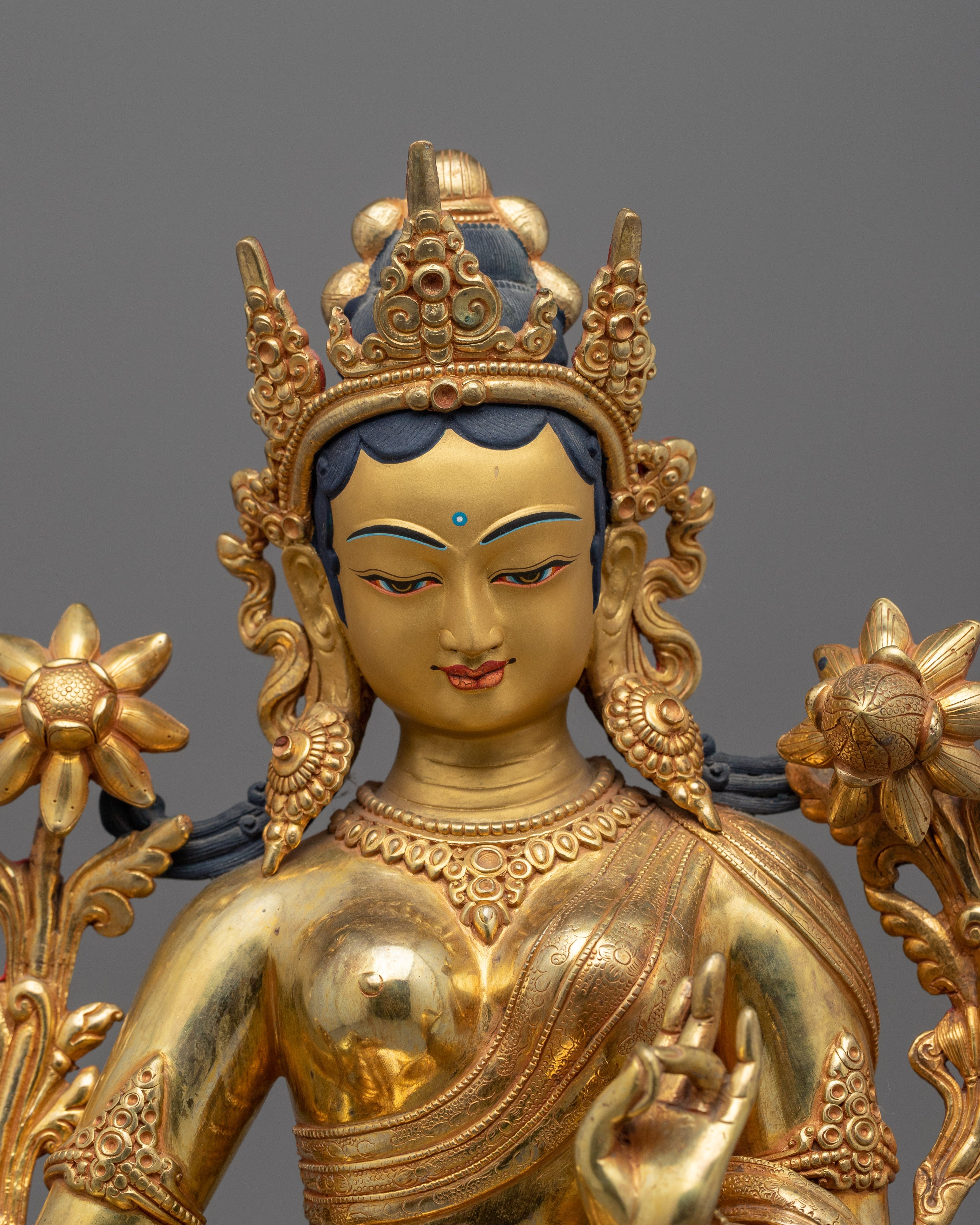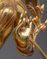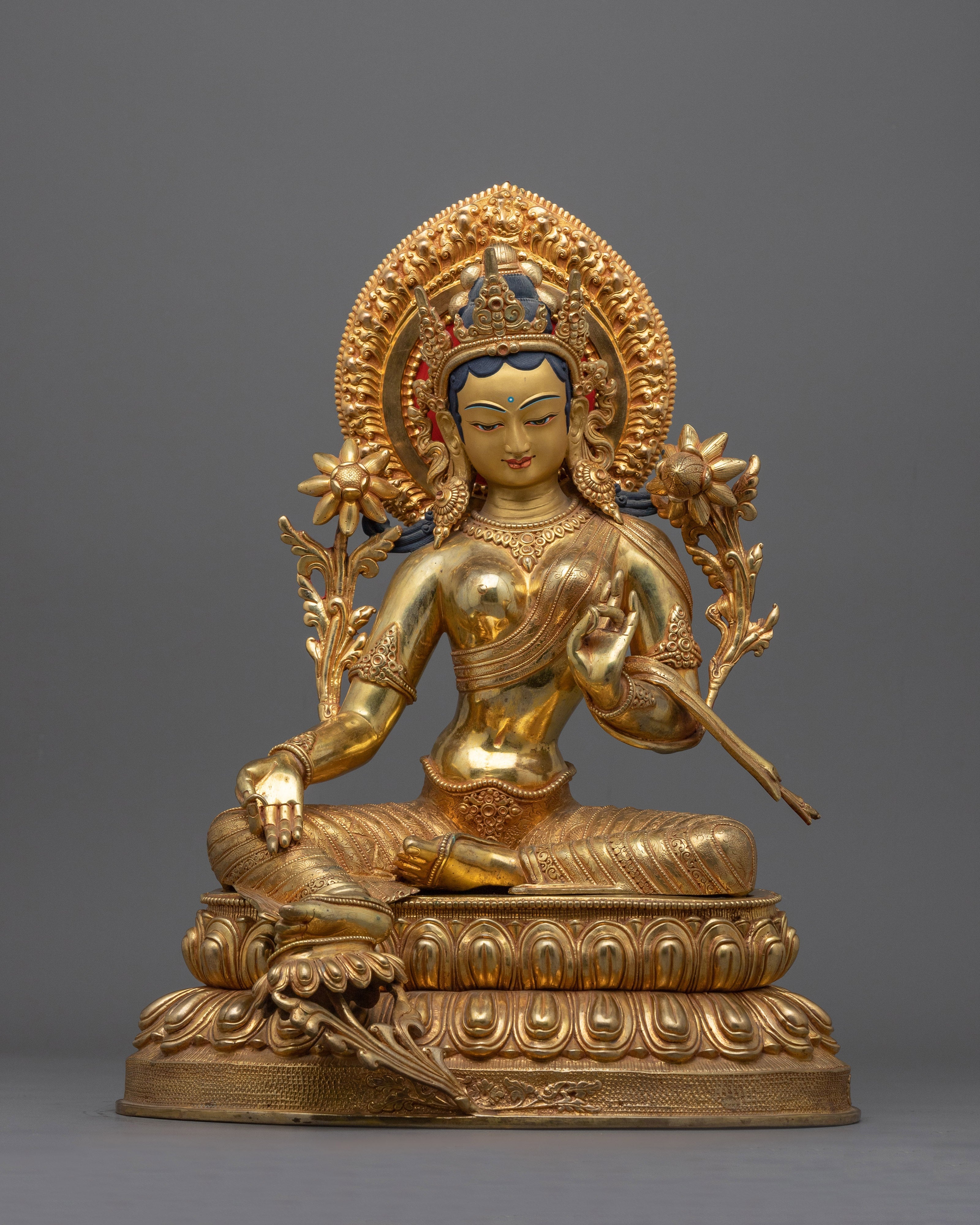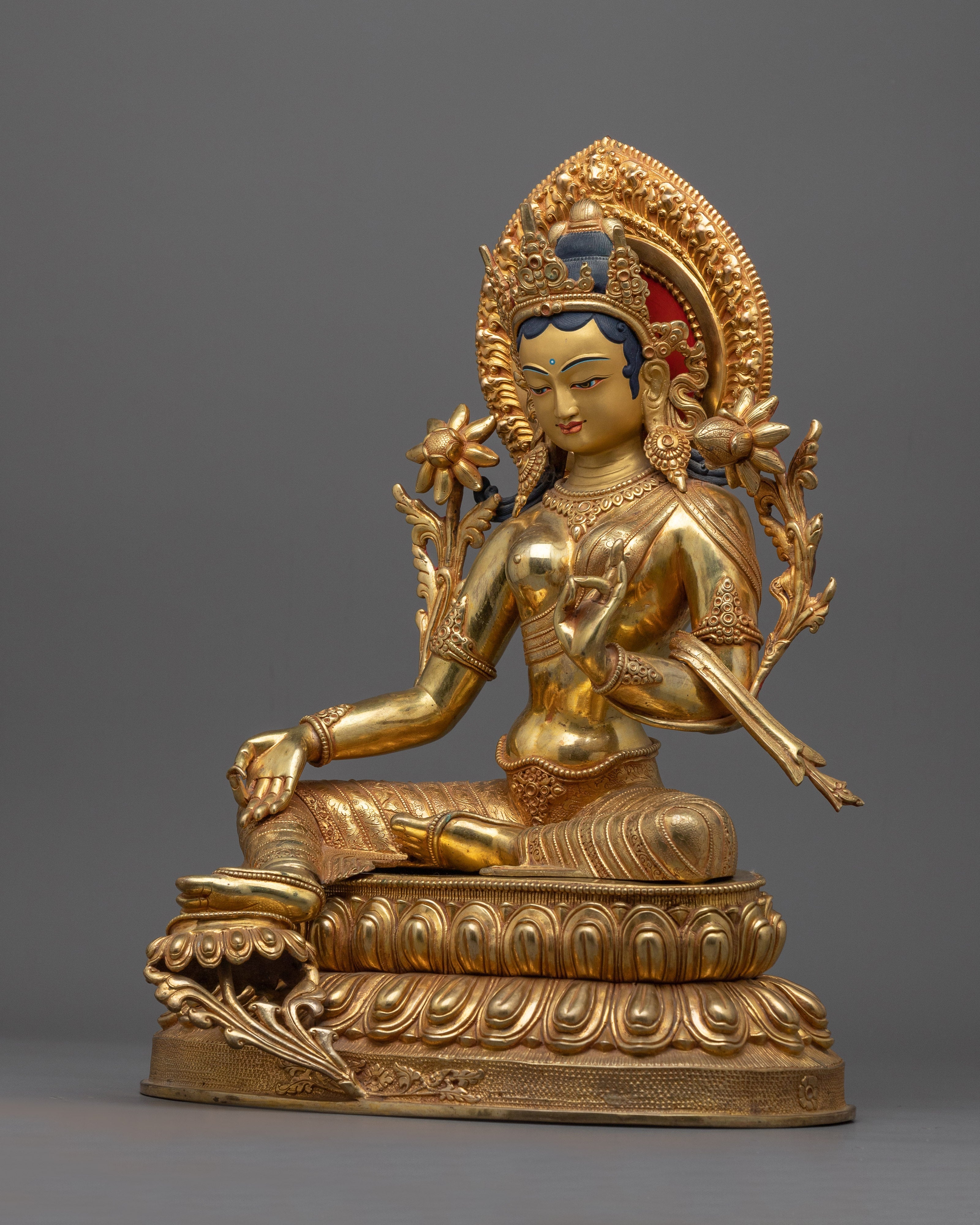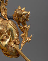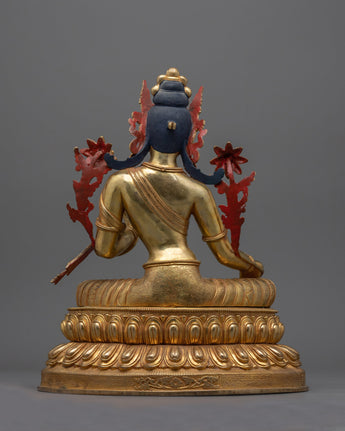 Renowned in Tibetan Buddhism, Green Tara is a brilliant female deity sitting on a lotus throne, embodying compassion and protection. She is ready to help people in need as soon as possible, as seen by her extended leg. Her shade of green is symbolic of life, activity, and prosperity. As they travel the spiritual path, devotees pray to her for direction and protection from fear and hardships. Saying "Om Tare Tuttare Ture Soha," her mantra, is said to grant wishes and bring her blessings. As evidence of her compassion and unwavering dedication to helping sentient creatures, Green Tara made the promise to continue incarnating until all beings achieve enlightenment.