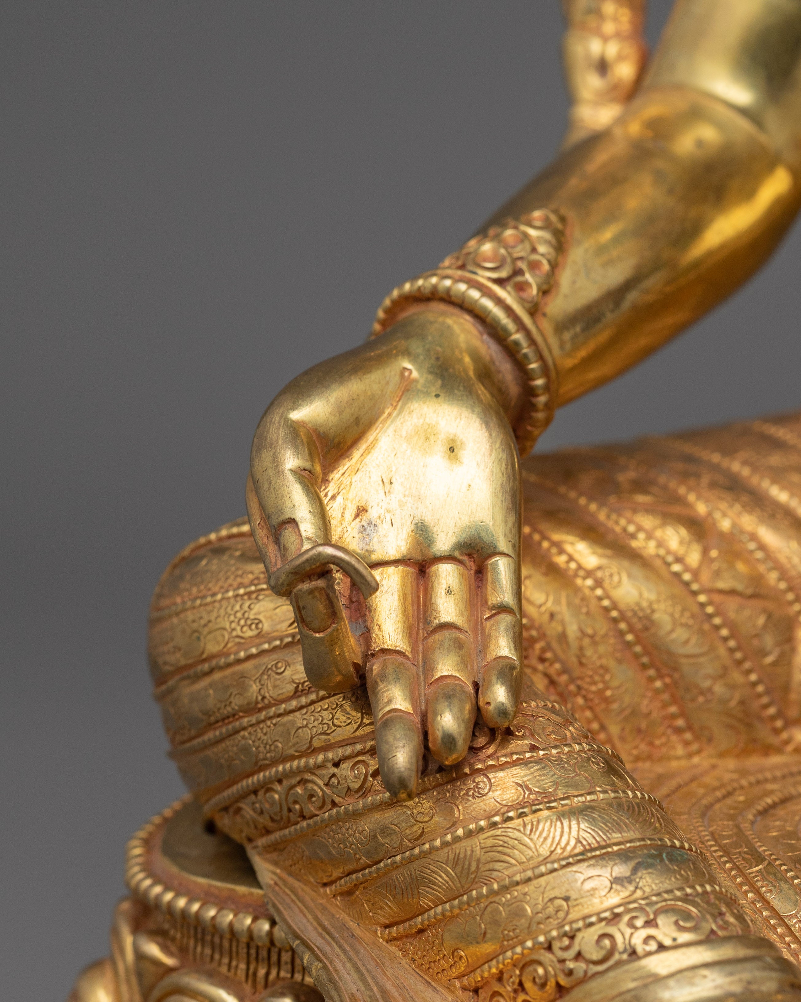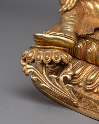 With the Diva Grace Green Tara Statue, you can embody the divine energy of empowerment and compassion. This beautiful sculpture, which was created with great attention to detail, exhibits elegance and beauty. With a height of 14.8 inches and a diameter of 11.6 inches, it captivates observers with its fine craftsmanship. With its intricate paints and 24K gold gilding, this statue perfectly captures the classic elegance of Green Tara. This handcrafted Diva Green Tara Statue is a representation of compassion and knowledge. The eternal beauty of Green Tara is reflected in every aspect of the copper body, which directs you onto a journey of spiritual development and empowerment.