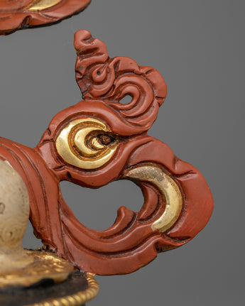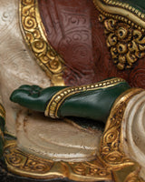 The Green Tara Sacred Feminine Sculpture is a work of Tibetan Buddhist art, skillfully created in Patan, Nepal. This statue, made of copper, gilded with 24K gold, and enriched with acrylic paints, exemplifies great workmanship as well as spiritual importance. This sculpture, measuring 13.2"/33.5cm in height and 11.0"/28cm at the base, and weighing 4.00 kg, is a glowing centerpiece for your altar, meditation room, or home decor.