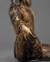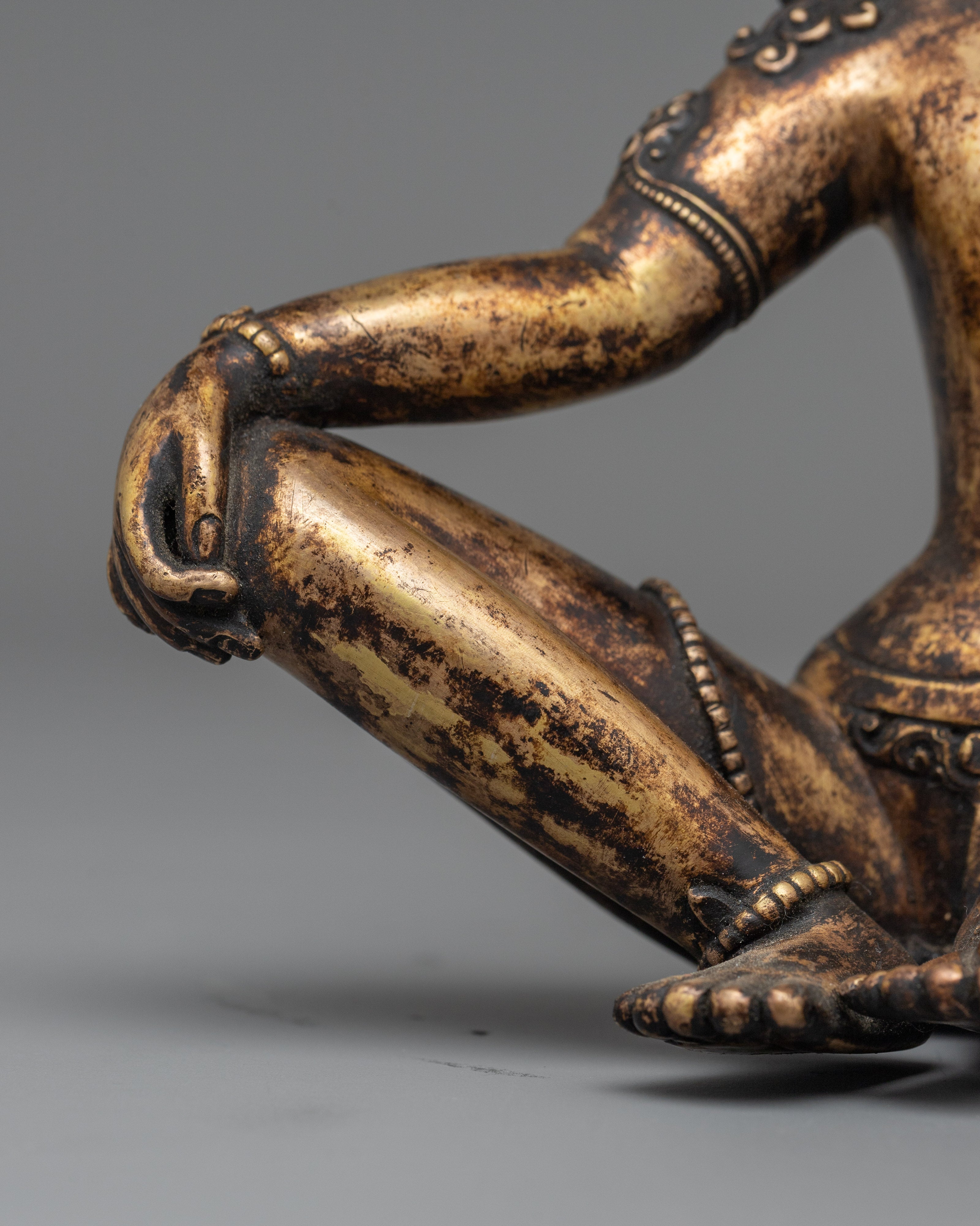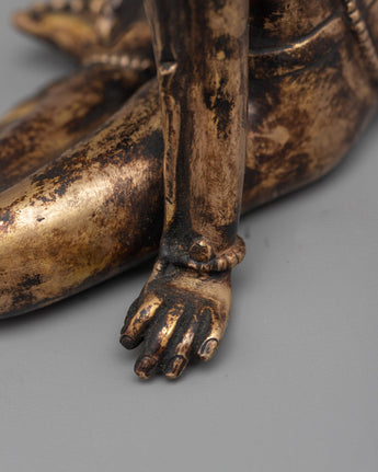 Crafted with a copper body and adorned with 24K gold gilding, this remarkable piece highlights Indra's heavenly majesty and brilliant strength. The sculpture appears aged thanks to the antique treatment, which highlights its historical and cultural value. This finishing procedure not only makes the piece look beautiful but also links it to Nepal's traditional metalworking traditions, where craftspeople apply age-old techniques to create contemporary marvels.