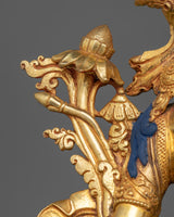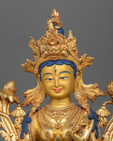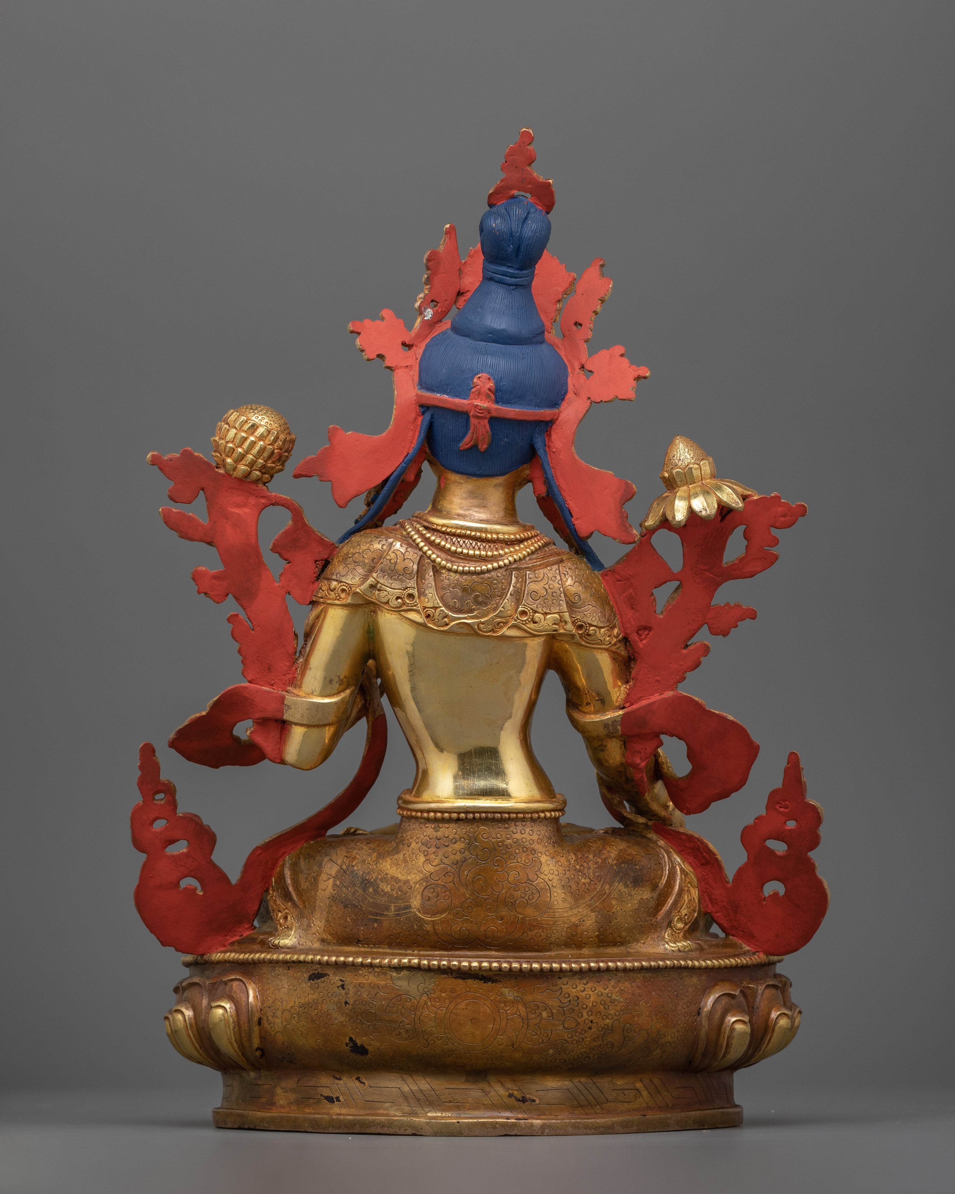 This created oxidized copper body, which was expertly crafted in Nepal, is embellished with intricate gold and acrylic paintings and 24K gold gilding, which express her serene and divine beauty. Dolma Karpo, the embodiment of compassion and longevity, is portrayed with a kind yet strong face, signifying her function as the guardian of sentient creatures.