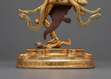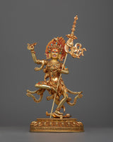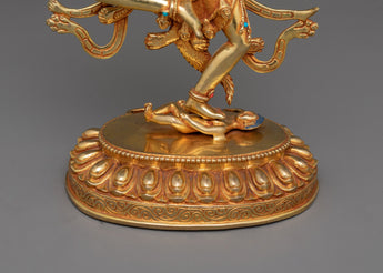 The Dorje Phagmo Fierce Feminine Power Statue, handcrafted in Patan, Nepal, is a powerful symbol of divine strength and spiritual growth. This sculpture, with a handcrafted copper body embellished with 24K gold gilding and delicate gold and acrylic paintings, reflects the region's artistry. It measures 11.0"/28cm in height, 7.5"/19cm at the base, and weighs 1.60 kg. It is both an exquisite decorative object and a profound spiritual symbol.