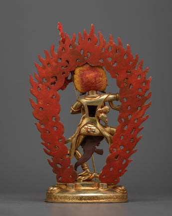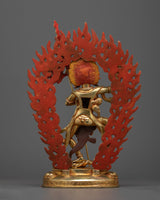 Dorje Phagmo is depicted in her dynamic form, standing with one leg bent and the other outstretched in a powerful stance, crushing obstacles underfoot. Her right hand holds a curved knife, symbolizing indestructible wisdom, while her left-hand holds a kapala (skull cup), representing the transcendence of worldly attachments. Her flaming aura symbolizes the burning away of ignorance and the illumination of the ultimate truth. The intricate gemstones that adorn her crown and ornaments further add to the statue’s majestic presence, creating an aura of fierce energy and transformative power.