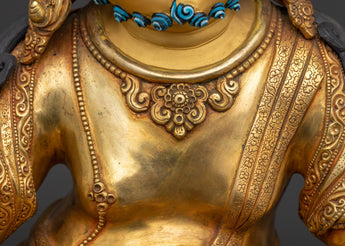 Handcrafted by expert artisans in Patan, Nepal, a city renowned for its rich legacy of spiritual artistry and metallurgy, this magnificent statue is one of a kind. The statue has a strong copper body that has been richly coated in 24K gold, giving it a bright and heavenly aspect. The elaborate paintings in gold and acrylic accentuate Dzambhala's fine qualities, such as his empathetic countenance and the symbolic items he carries, which symbolize his function as a wealth-bringer and guardian against monetary hardships. The statue's eternal elegance and spiritual importance are guaranteed by the gilding and painting techniques that accentuate its sacred beauty.