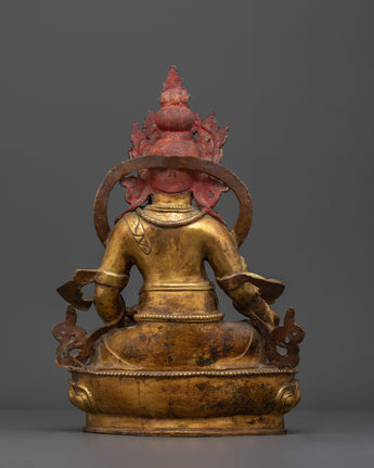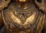 The Dzambhala Hand Carved Jewels Deity Statue is a 33.5 cm tall statue that has been skillfully made from finest copper and gilded in 24K gold. This monument brings prosperity into any area by encapsulating the essence of Dzambhala's altruistic attitude. The sculpture has a timeless elegance that harmonizes with any setting thanks to the antique finish, vivid gold paint, and acrylic paints.