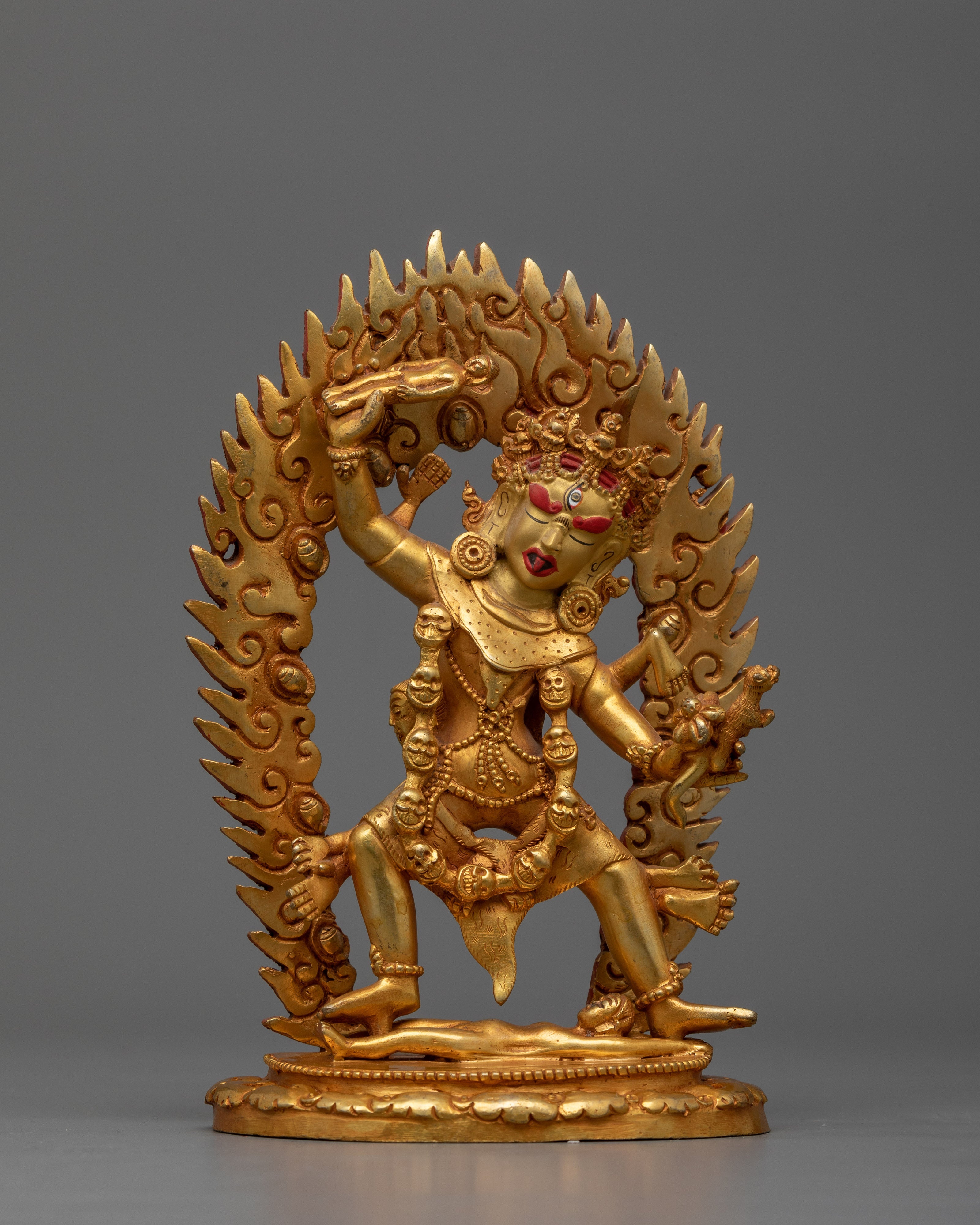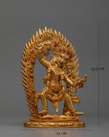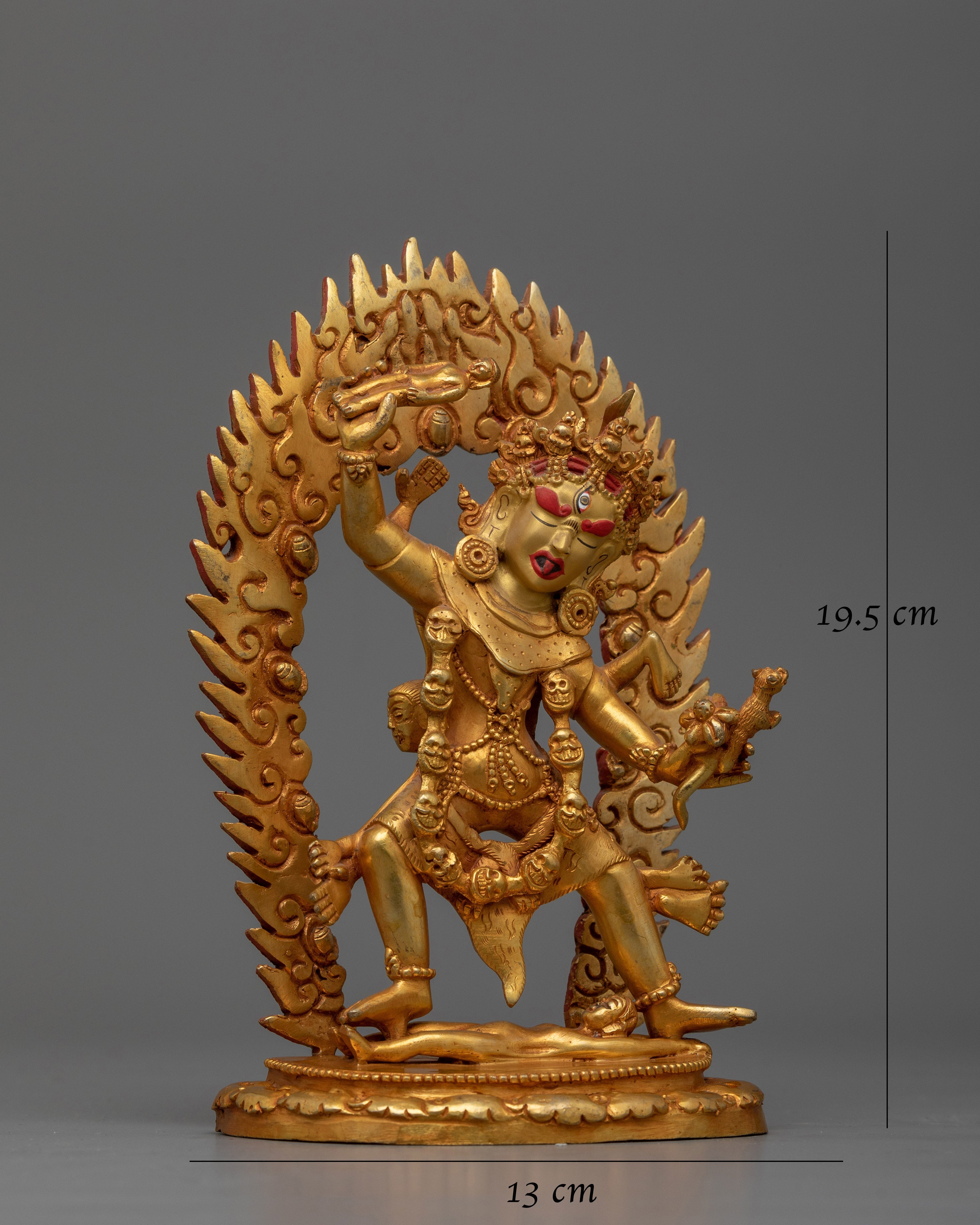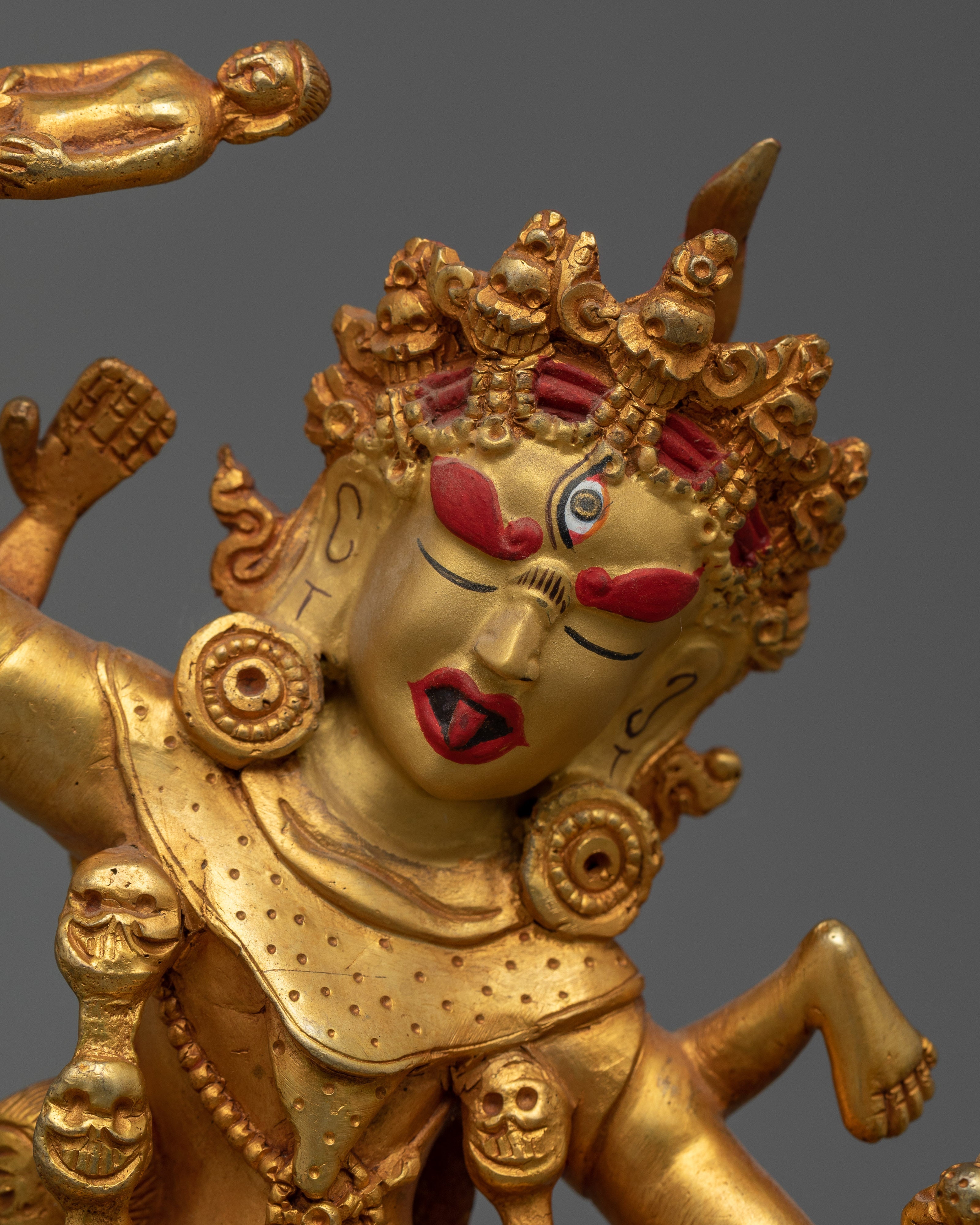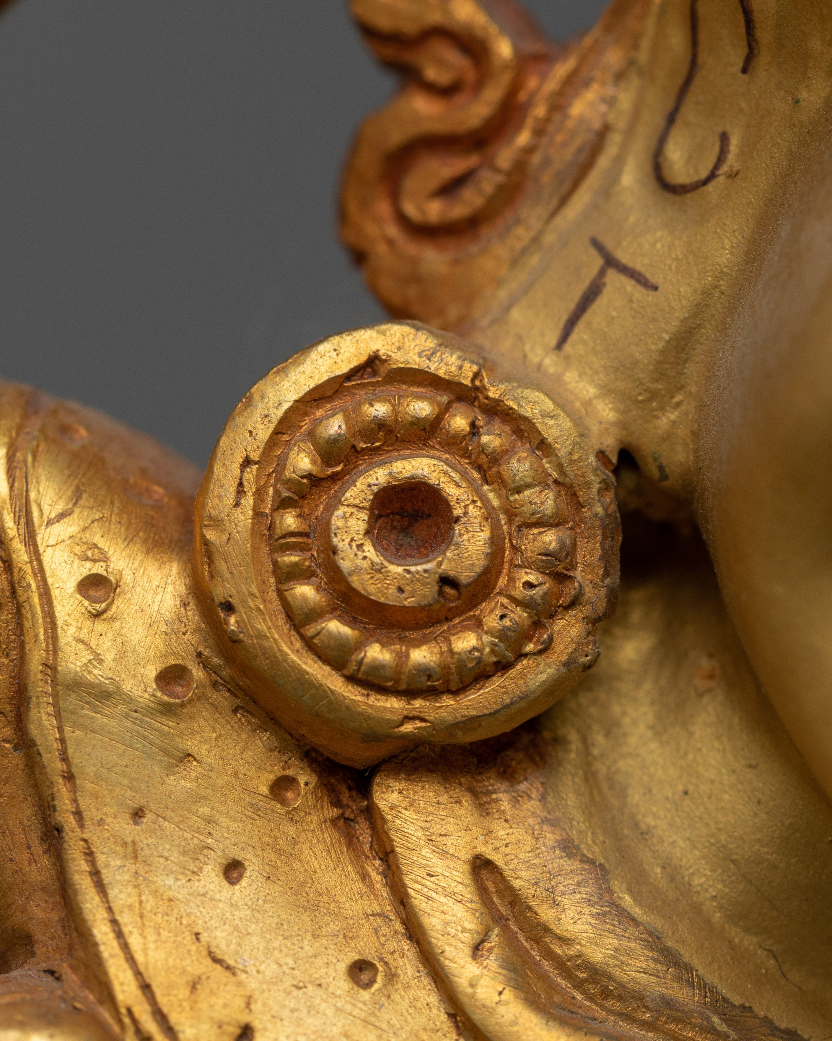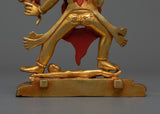The Ekajati Handmade Small Statue is 19.5 cm tall, finely carved from finest copper and gilded in 24K gold. This statue is a powerful addition to any spiritual area since it perfectly depicts the ferocious and protective energy of Ekajati. The deity's potent characteristics and attributes are emphasized by the intricate carvings and bright gold finish, signifying her function as the keeper of sacred teachings.