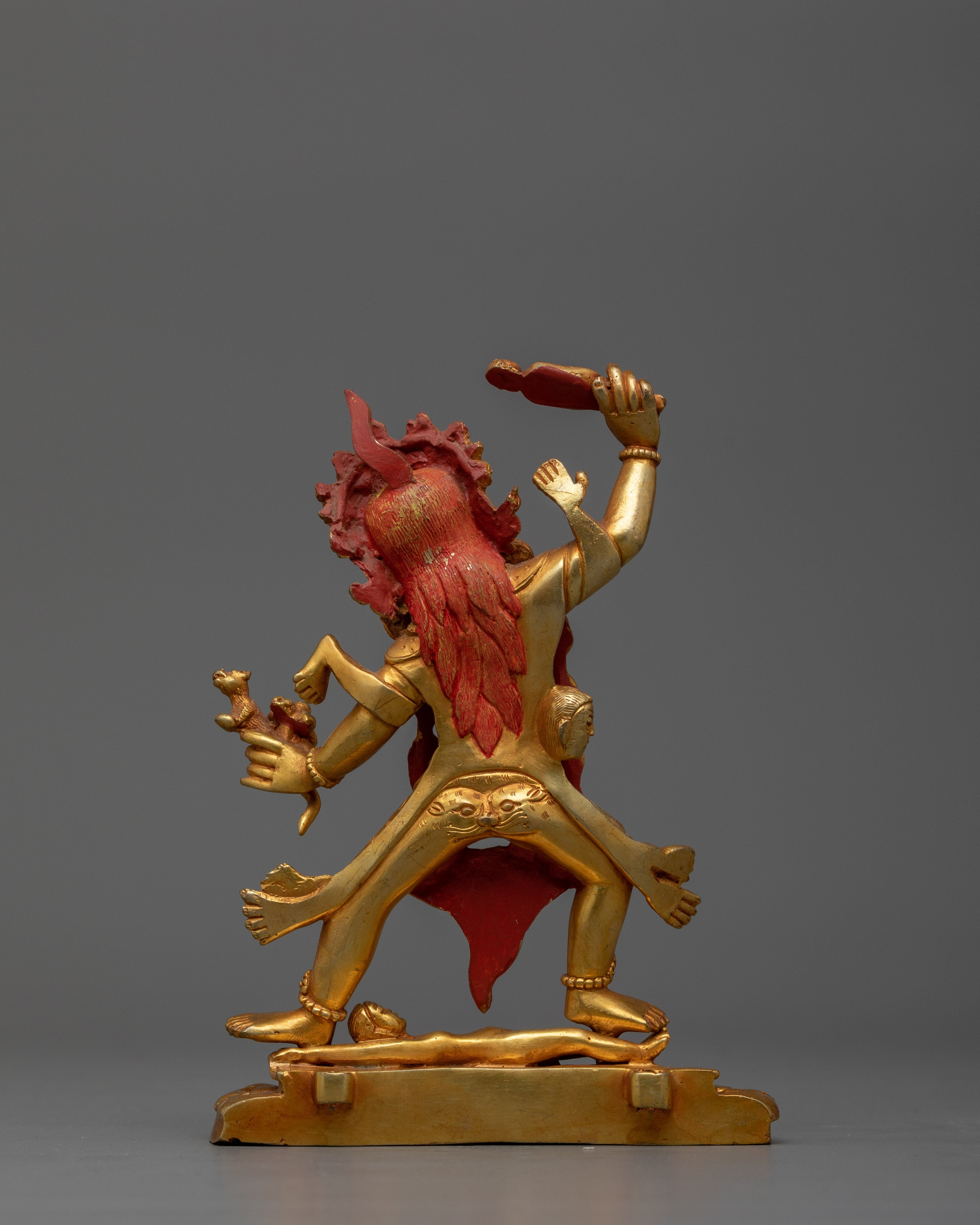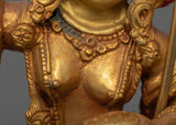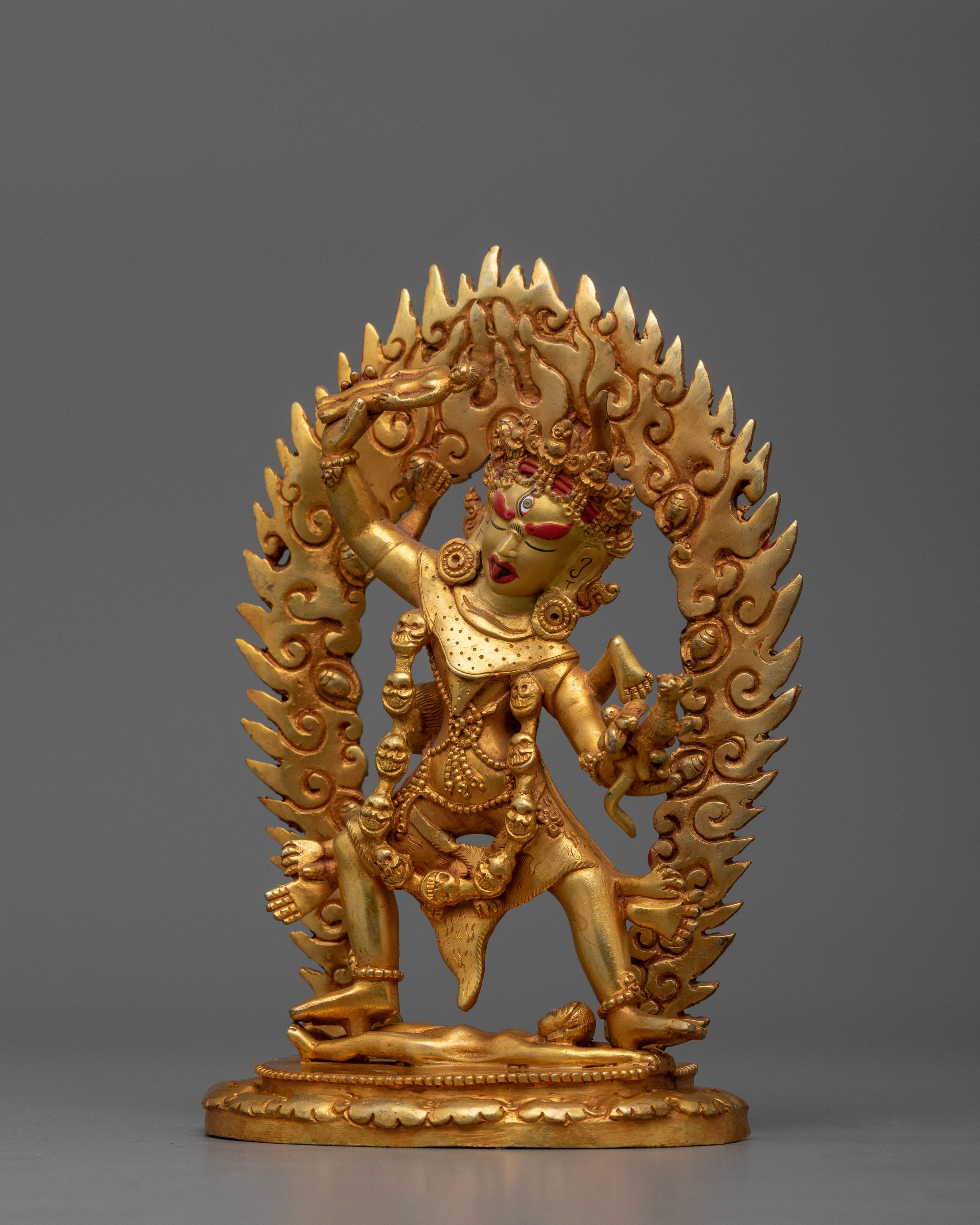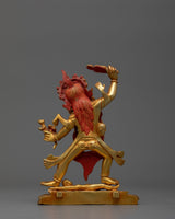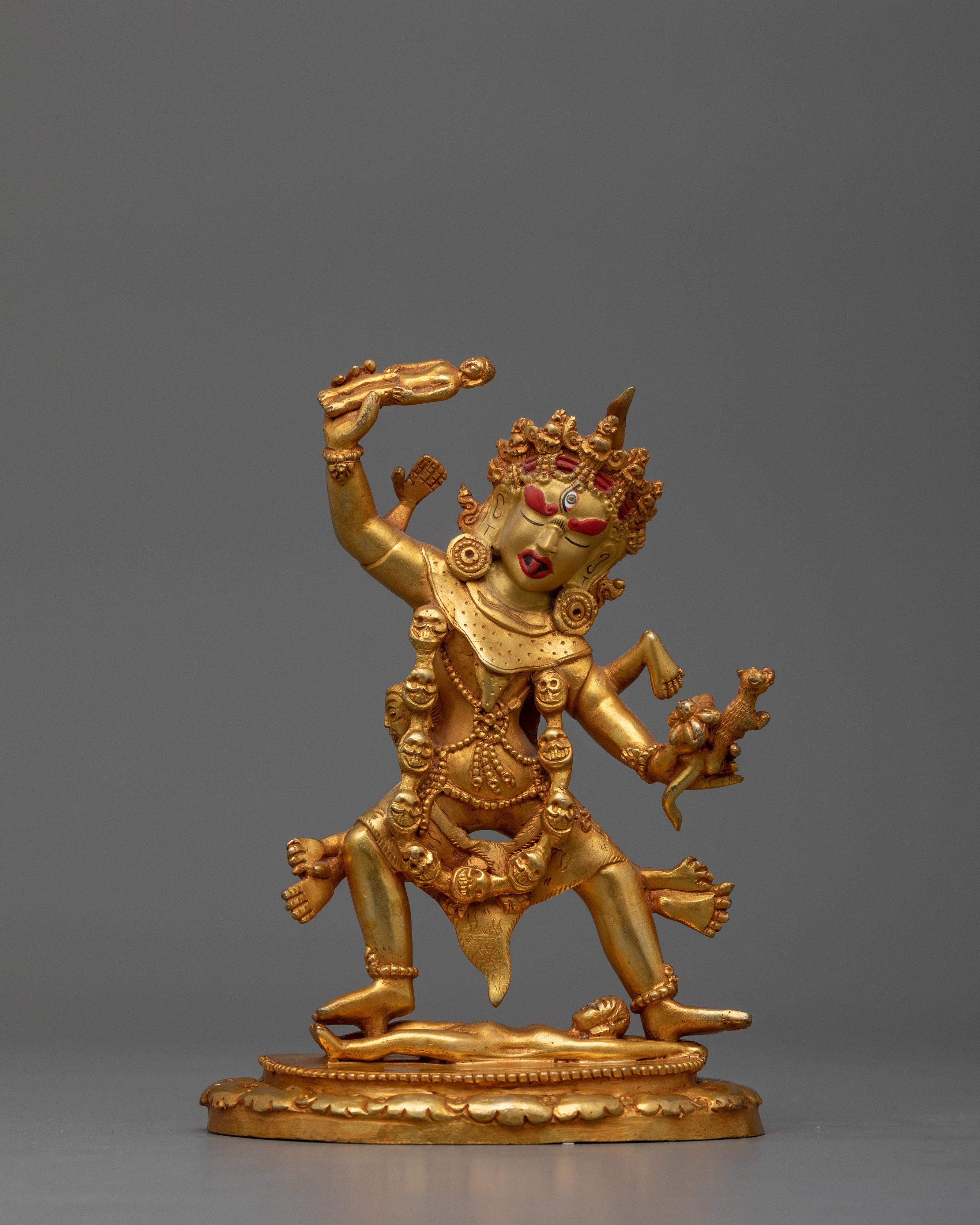 The Ekajati Handmade Small Statue is 19.5 cm tall, finely carved from finest copper and gilded in 24K gold. This statue is a powerful addition to any spiritual area since it perfectly depicts the ferocious and protective energy of Ekajati. The deity's potent characteristics and attributes are emphasized by the intricate carvings and bright gold finish, signifying her function as the keeper of sacred teachings.