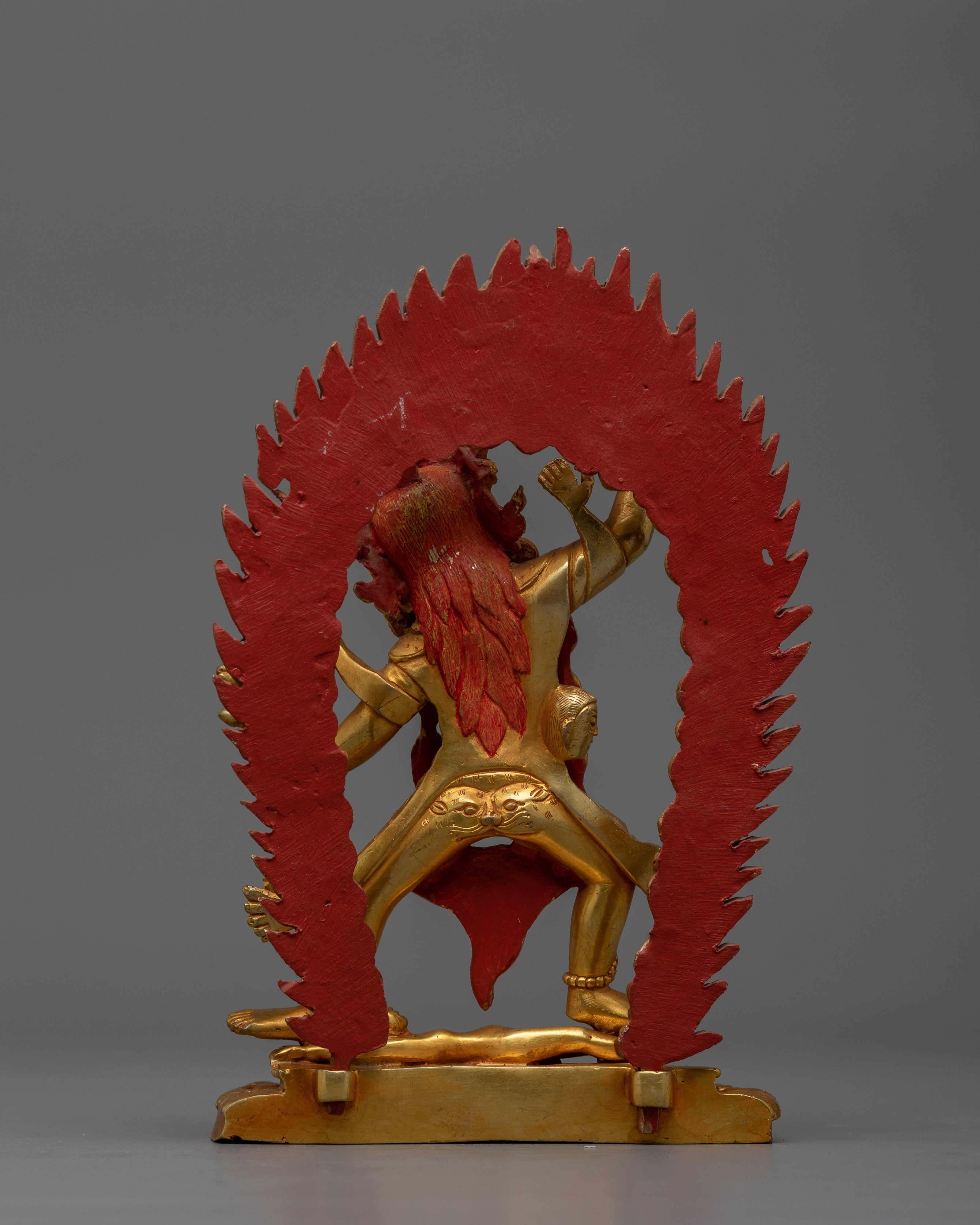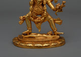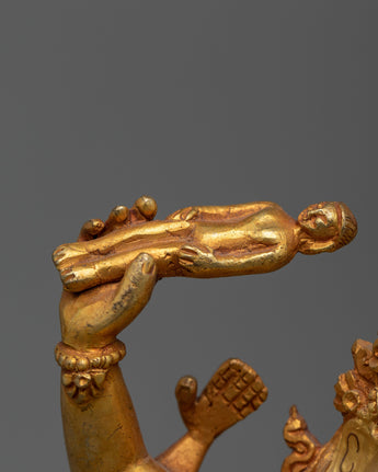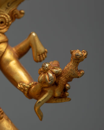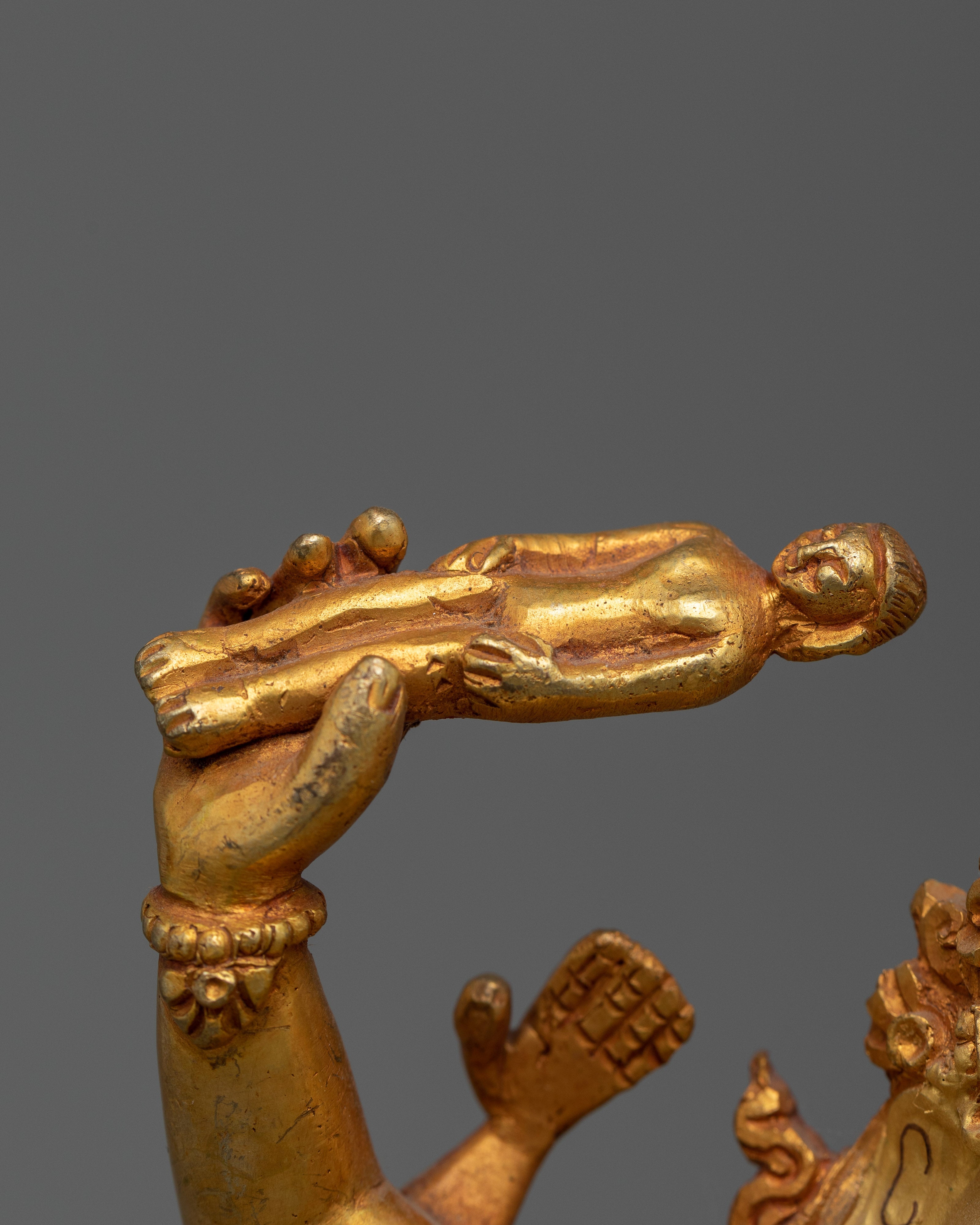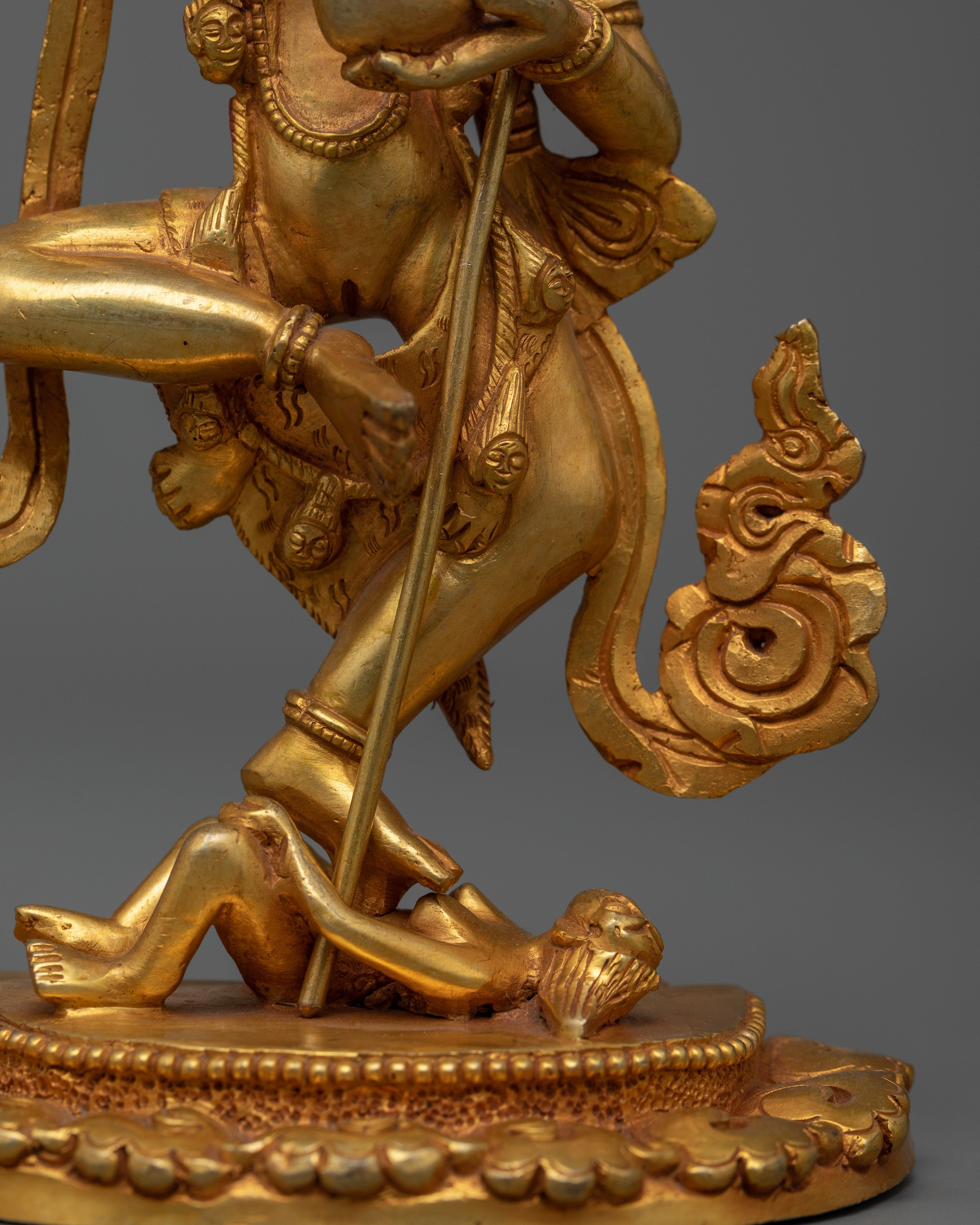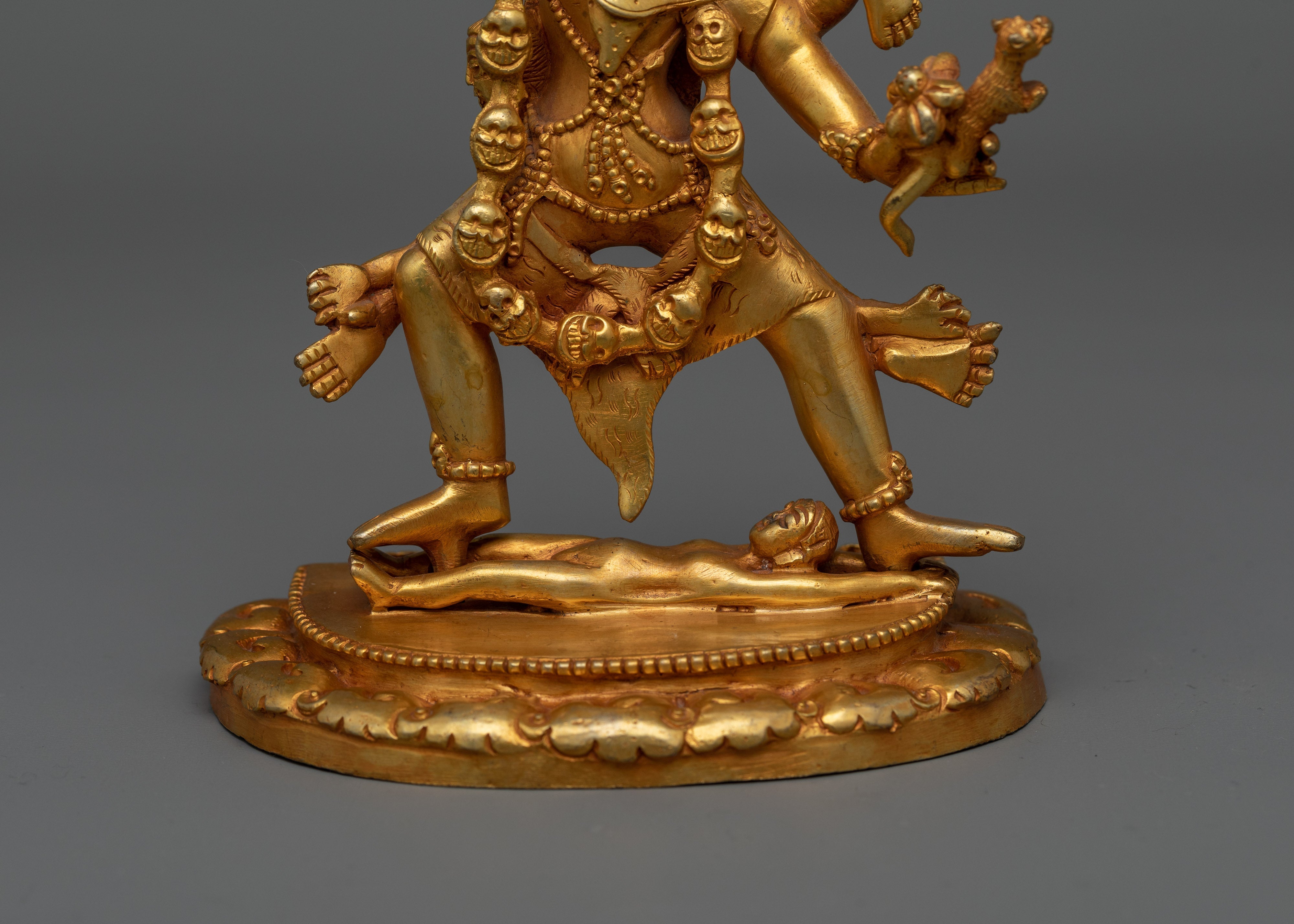 The Ekajati Handmade Small Statue is 19.5 cm tall, finely carved from finest copper and gilded in 24K gold. This statue is a powerful addition to any spiritual area since it perfectly depicts the ferocious and protective energy of Ekajati. The deity's potent characteristics and attributes are emphasized by the intricate carvings and bright gold finish, signifying her function as the keeper of sacred teachings.