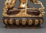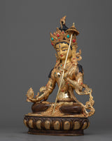 This magnificent statue, embellished with elaborate 24-karat gold and acrylic decorations on its oxidized copper body, depicts the tranquil expression of Sitatapatra, who is revered in the Buddhist tradition as a powerful deity who grants protection from negativity and impediments. Allow this sculpture to be a prominent point in your home, a source of inspiration and calm on a regular basis.