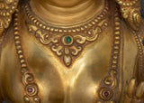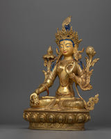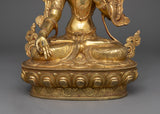 The Buddhist White Tara Goddess statue is a representation of the Goddess of Compassion and Longevity which was handcrafted in Patan, Nepal. The statue is made of copper and gilded with 24K gold and has been adorned with intricate gold and acrylic paints that demonstrate remarkable craftsmanship. With a height of 14.6"/37cm and a base width of 9.4"/24cm, this sacred sculpture weighs 5.75 kg and represents the eternal guidelines of healing and knowledge.