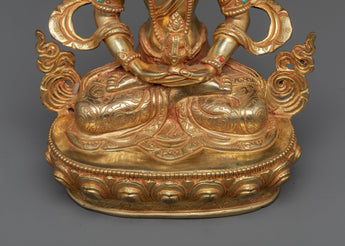 With our Guru Amitayus, explore the realms of exquisite beauty and spiritual profundity. The exquisite 24k gold plating on each piece, carefully molded from pure copper, gives it an ethereal radiance. Delicate 24k gold and acrylic paintings that meticulously narrate a story of divinity enhance creativity. This piece's weight and size have been carefully considered to make it an adaptable addition to any religious place or home decor. Guru Amitayus is a manifestation of boundless life and enlightenment, not merely a depiction. The harmonic combination of gold and copper ensures that it does more than just beautify a room but elevates it.