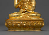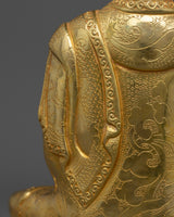 The serene Amoghasiddhi statue which represents active enlightenment, stands gracefully at 8.5 inches (21.5 cm) in height with a base width of 5.9 inches (15 cm). This piece is crafted from a copper body and adorned with 24K gold gilding, enhanced by intricate gold and acrylic paintings.