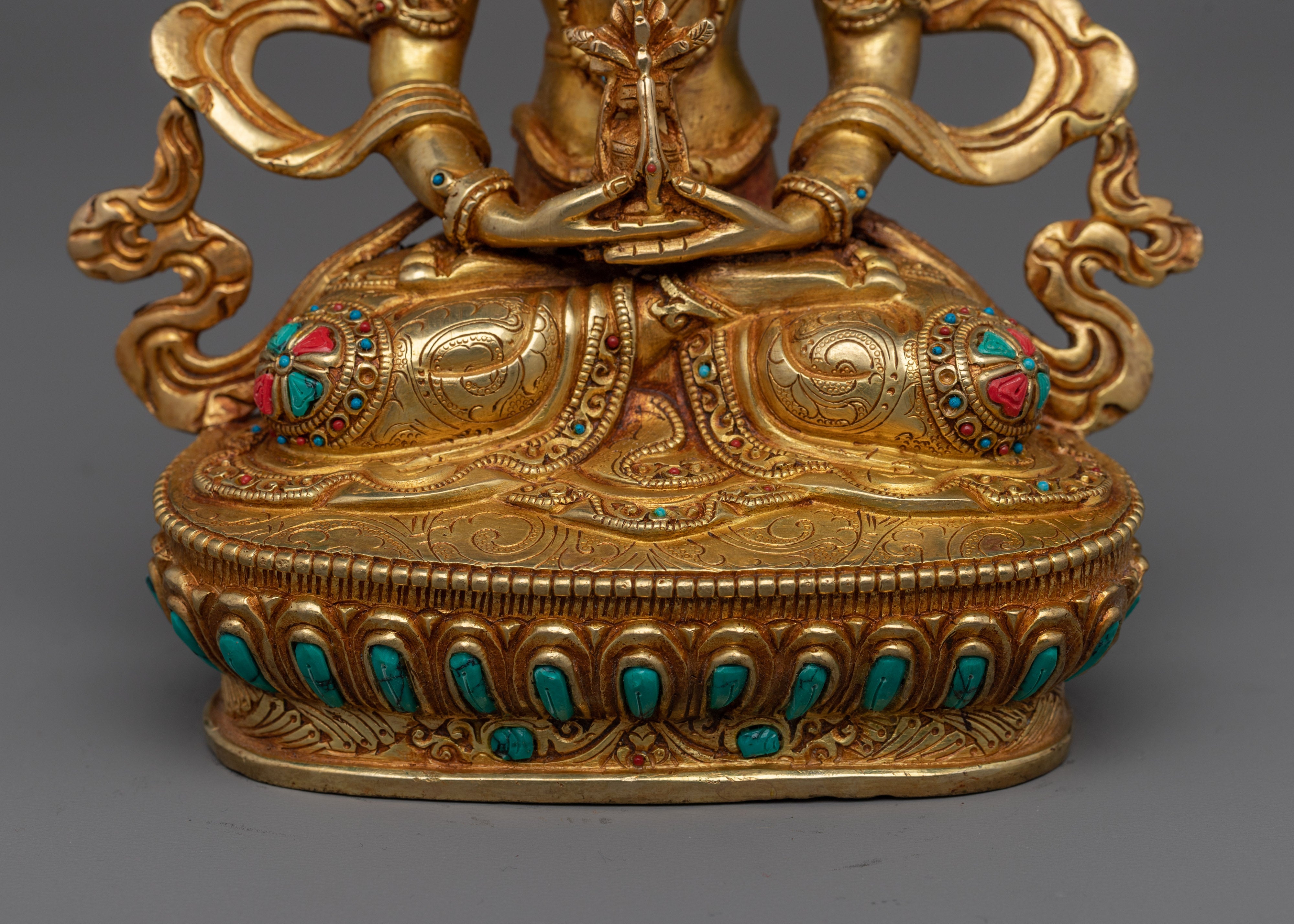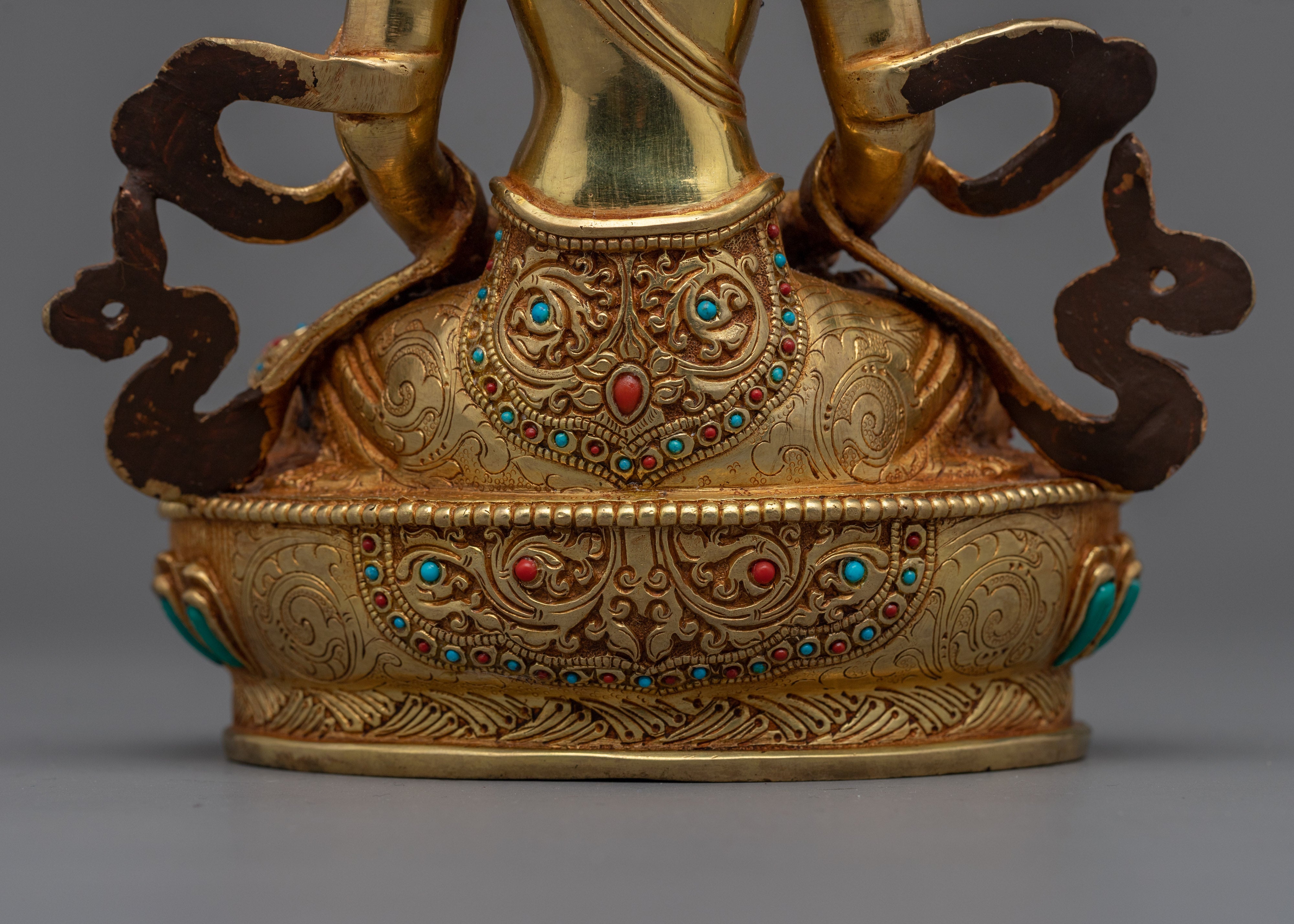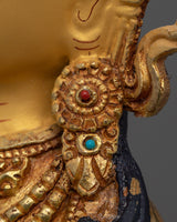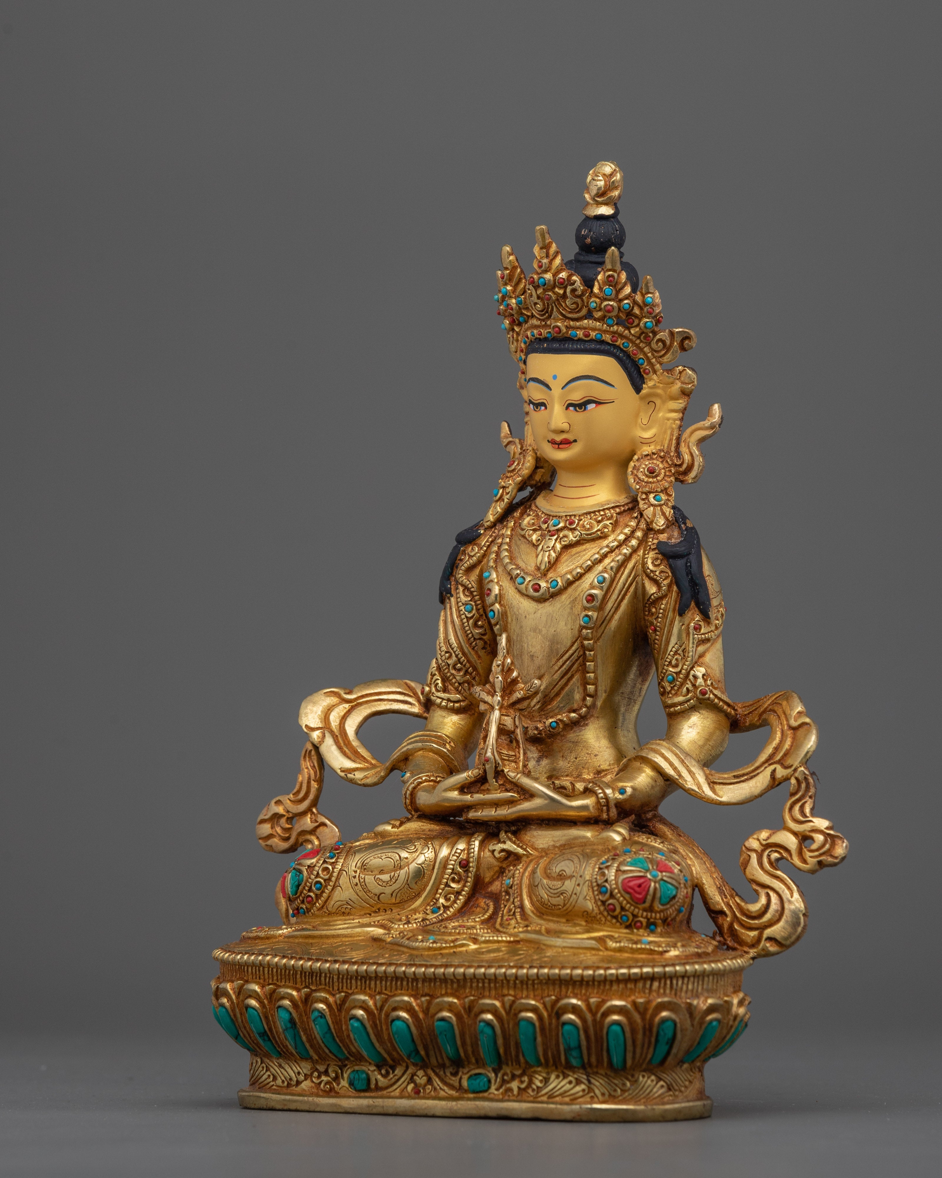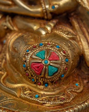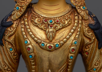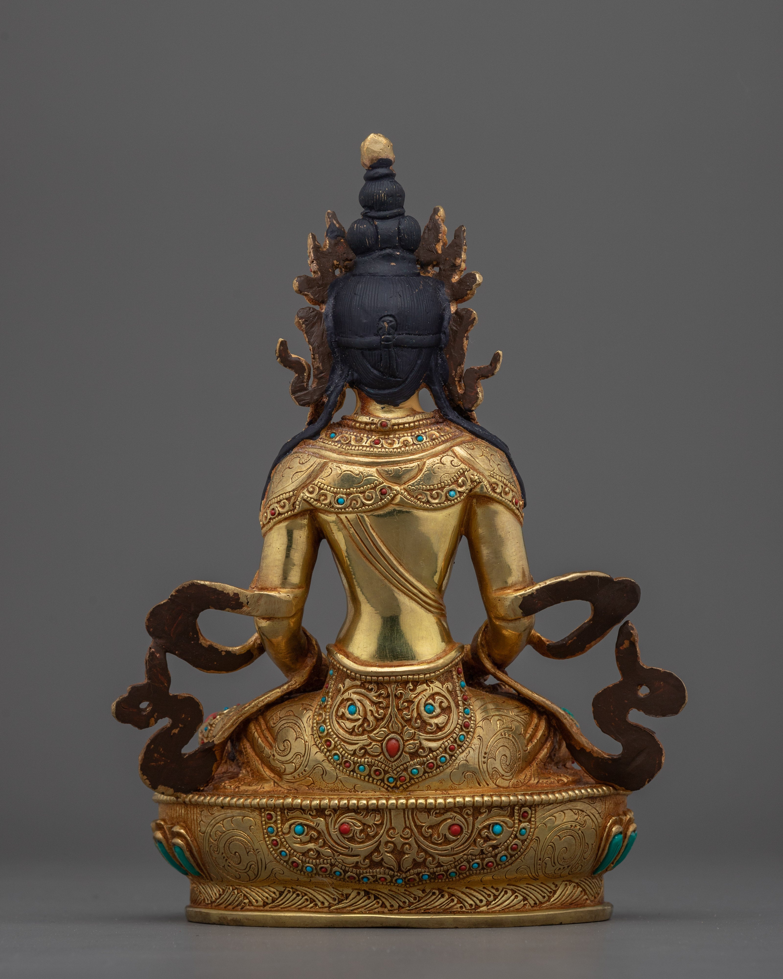 This beautiful Eternal Life Amitayus statue is 9"/23 cm tall with a base width of 6.7"/17 cm and weighs 1.44 kg. This sculpture, carefully created from a copper body, contains sumptuous 24K gold gilded accents and brilliant gold and acrylic paintings, which are complemented by hand-carved jewels. Each aspect demonstrates the statue's sophisticated artistry and spiritual depth, making it an inspiring addition to any meditation altar or Buddhist shrine.