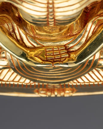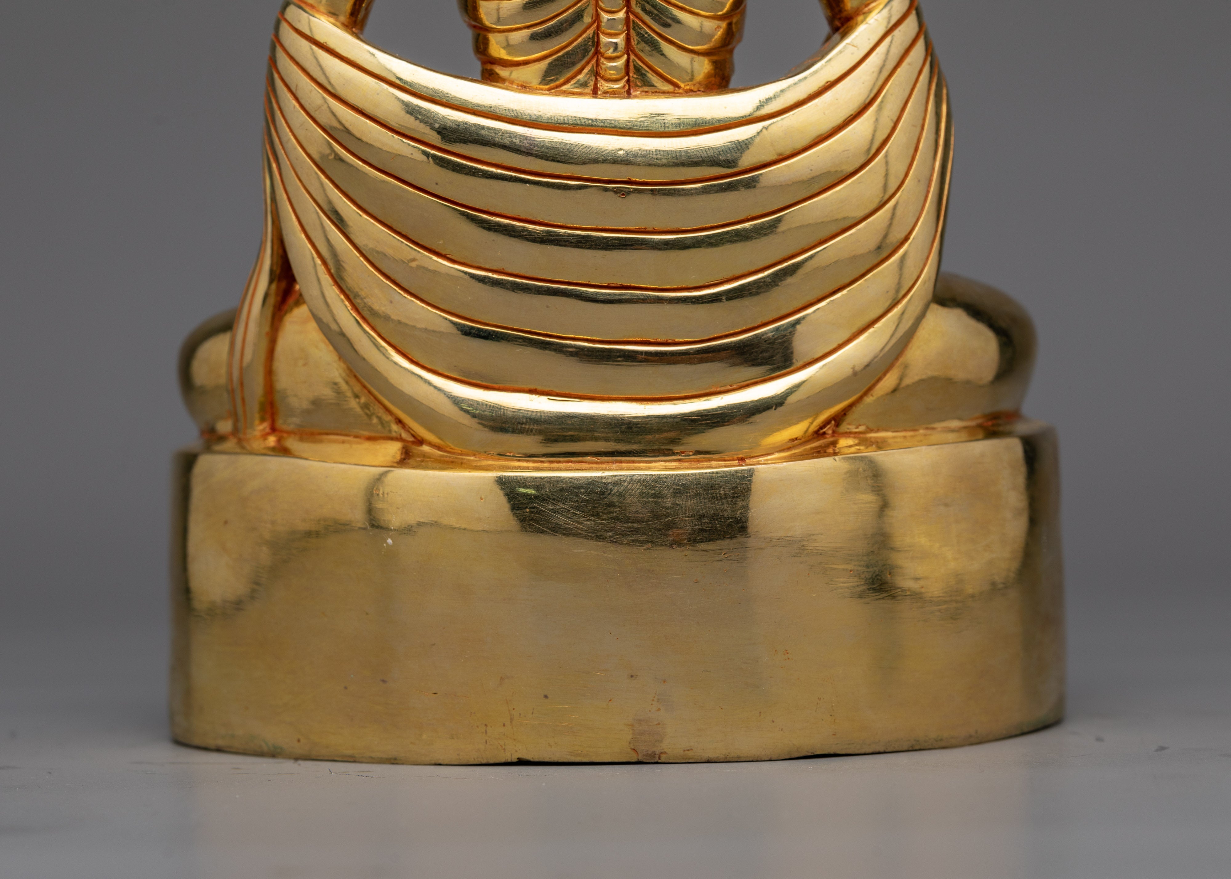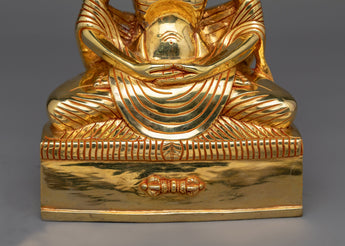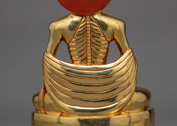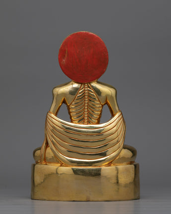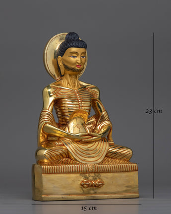 Accept the profound lessons of asceticism with the Fasting Buddha Gold Gilded Statue, a remarkable depiction of the Buddha's rigorous meditation and fasting. Standing 23 cm tall, this statue is precisely carved from a copper body and finely polished with 24K gold gilding, showcasing the Buddha's detailed curves and skeletal shape during his fast.