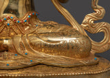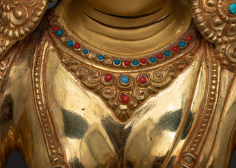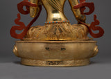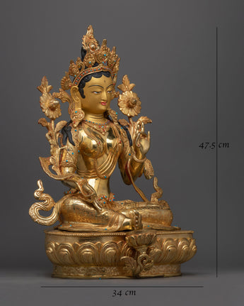 Presenting our beautiful Female Deity Green Tara statue, an expertly carved work of art from Patan, Nepal's talented artisans. This statue is made of copper and has an outstanding height of 18.7 inches with a base of 13.4 inches. It is decorated with acrylic paintings, 24K gold gilding, and gold. This gorgeously detailed and artistic depiction of Green Tara, who is highly esteemed in Mahayana Buddhism for her protection and compassion, captures her calm and enlightened essence.