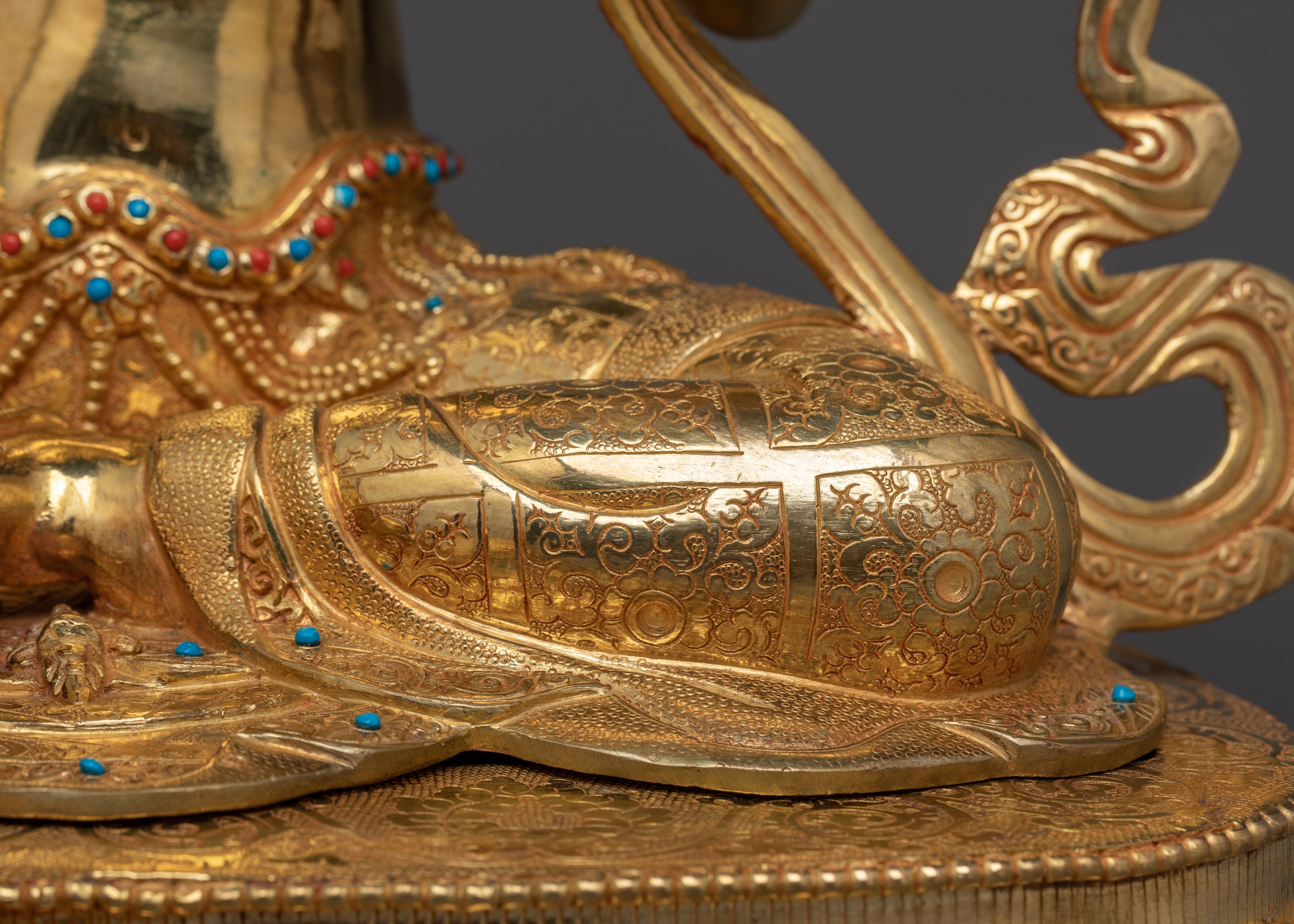 The attention to detail and skill of Patan's artisans are evident in every aspect of this Green Tara monument. Tara's calm countenance and the intricate designs and vivid hues of the acrylic and gold paintings showcase the remarkable artistry of this statue. Its weight of 10.32 kg is a significant indicator of its excellence and the careful craftsmanship that went into making it.