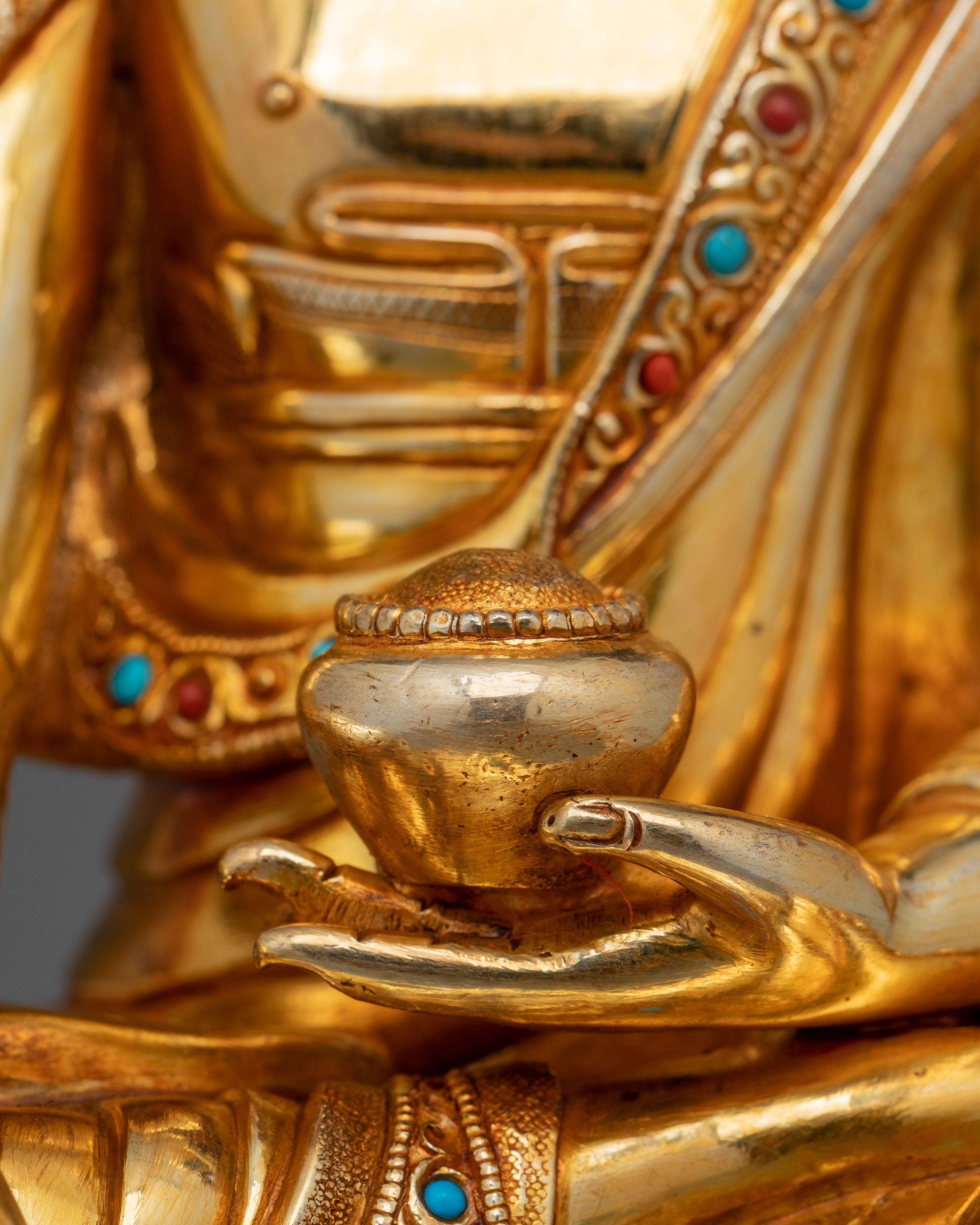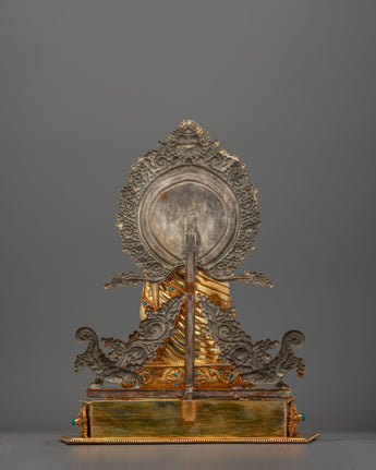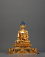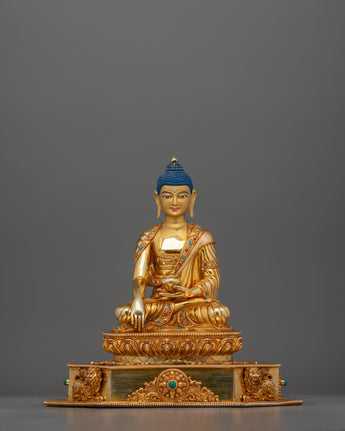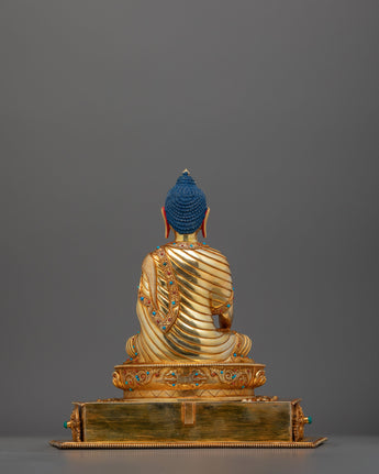The Shakyamuni Buddha for Zen Decor, sculpture is designed to bring calm and enlightenment into your spiritual area. This statue is handcrafted by expert artisans in Patan, Nepal, constructed of copper, gilded with 24K gold, and embellished with detailed gold and acrylic paintings. This piece, measuring 12.6"/32cm in height and 10.4"/26.5cm at the base, weighs 2.35 kg and embodies the elegance and peace of Buddhist creativity, making it an essential complement to any meditation or altar space.