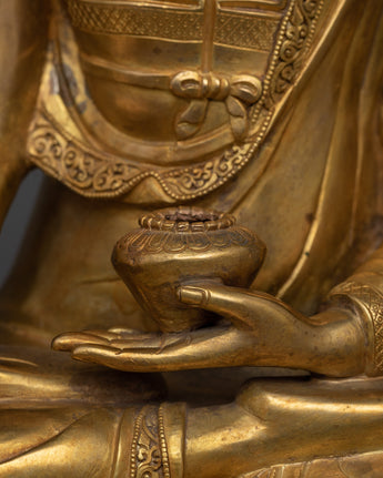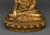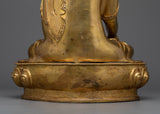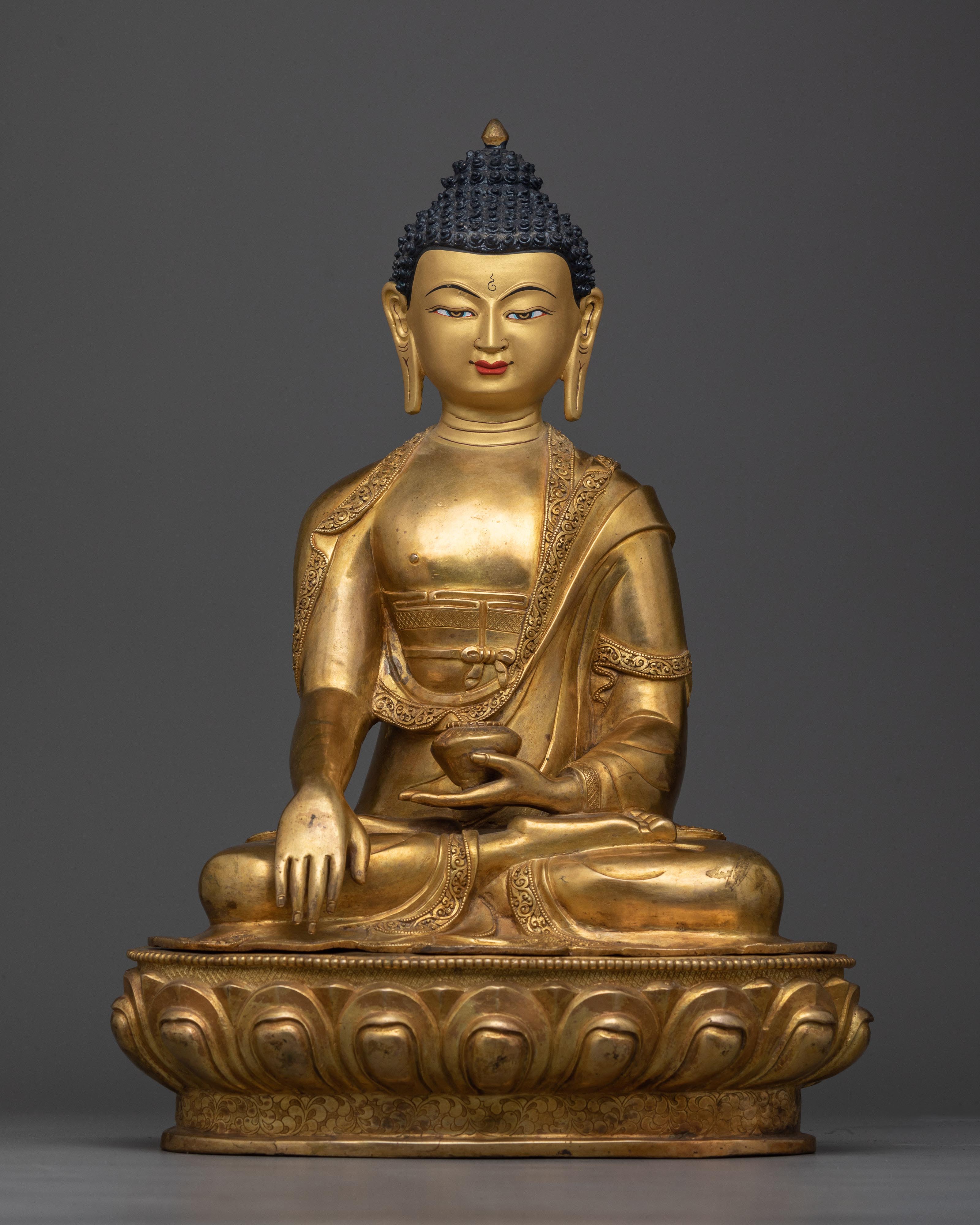 This magnificent statue of Gautam Shakyamuni Buddha is a monument to meticulous craftsmanship, revealing a harmonic blend of creativity and spiritual resonance. Each feature of the statue, which stands an amazing 16.5 inches tall, has been meticulously carved, from the delicate curve of Buddha's lips to the exquisite patterns of his robe. It is made of robust copper and guarantees both longevity and timeless beauty. The beautiful 24k gold gilding, along with carefully placed acrylic paintings, lends depth and richness to the statue, making it a valued property for any collector or spiritual aficionado.