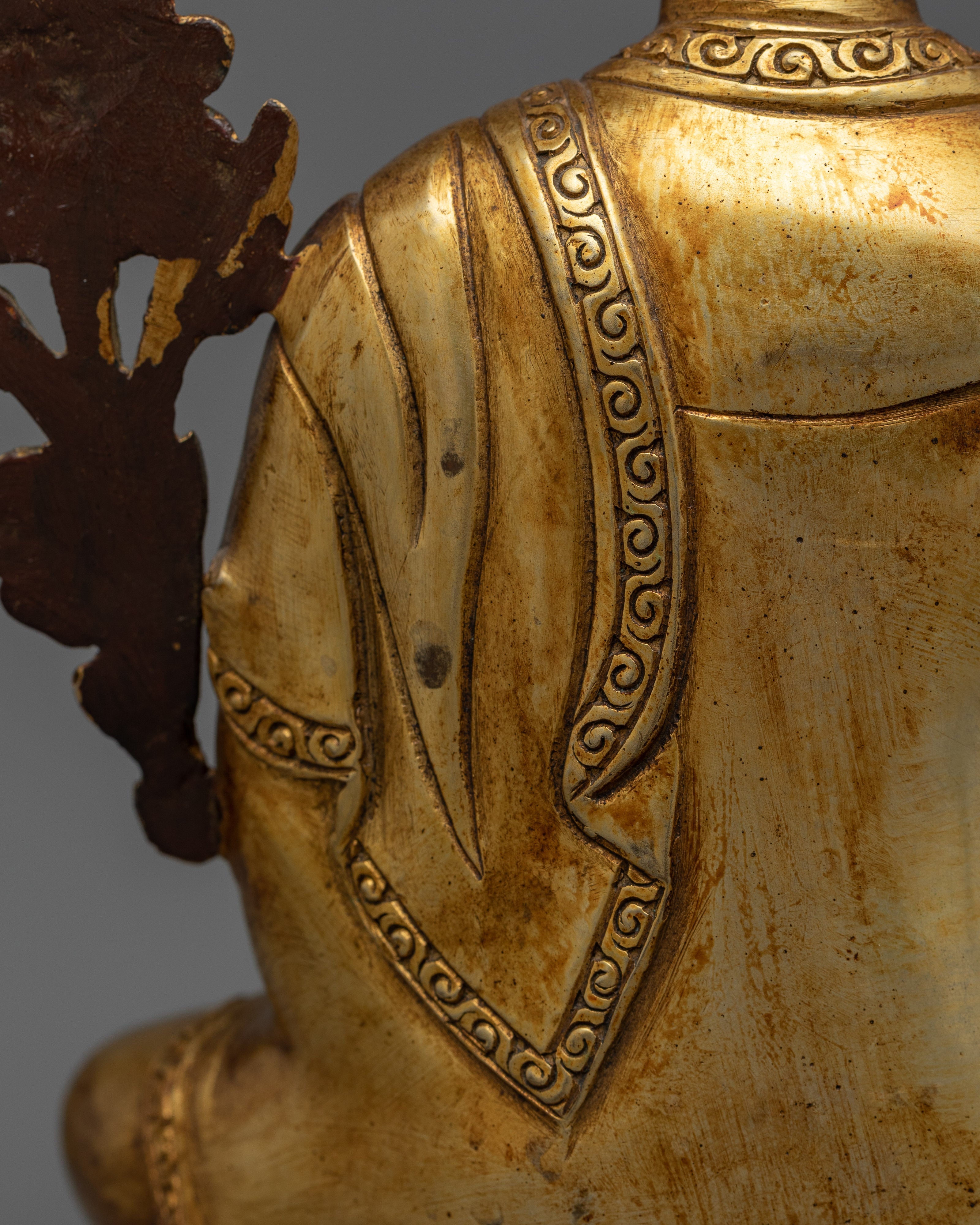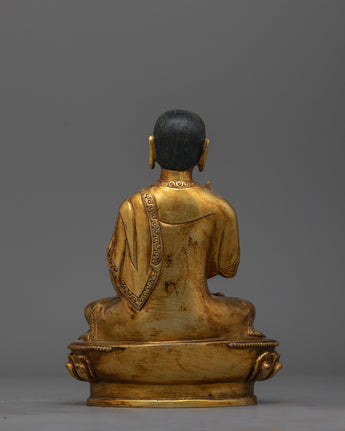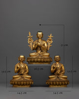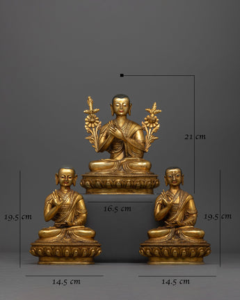 This set, made of fine copper and gilded in 24K gold, exemplifies luxury and sanctity. The elaborate gold and acrylic paints enhance each figure, displaying beautiful robes and tranquil looks, and weigh a total of 5.340 kg, highlighting their significant presence. This trio of statues is an inspiring centerpiece for any place dedicated to meditation and spiritual growth.