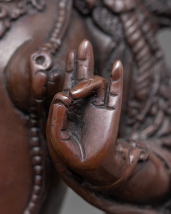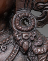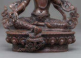 We have carefully hand-carved this delicate Goddess Green tara Buddhism Sculpture. It took us months of dedication to craft this Sgrol-lang Statue made up of an oxidized copper body. The Deity is positioned on a Moon Disc upon a lotus seat, where she holds an utpala (held between thumb and ring finger) on her left hand. While her other hand displays Granting mudra, bestowing generosity. We used a hammer and small chisels to hand-carve the intricate design patterns.