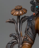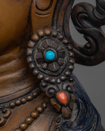 This Goddess of Compassion and Healing White Tara, finished in an oxidized copper body and decorated with gemstones, represents compassion and healing energy. This sacred monument, measuring 12.6 inches (32 cm) in height and 8.3 inches (21 cm) across the base, weighs 3.16 kg and has been created to encourage peacefulness and tranquility. White Tara is a respected deity in Tibetan Buddhism who represents unlimited compassion. She is also known for her connection with healing and longevity, making her an important figure among practitioners who seek peacefulness and protection.