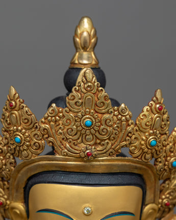 This stunning statue has a copper body that has been skillfully crafted and is gilded in 24K gold. Gold and acrylic acrylics accentuate the fine details of Chenrezig's expression and the elaborate patterns on his attire, giving the picture more depth and vitality. The encrusted gemstones, which represent Chenrezig's spiritual significance, lend an air of heavenly beauty. Its impressive weight of 8.63 kg makes it perfect for any area used for spiritual development, meditation, or introspection.