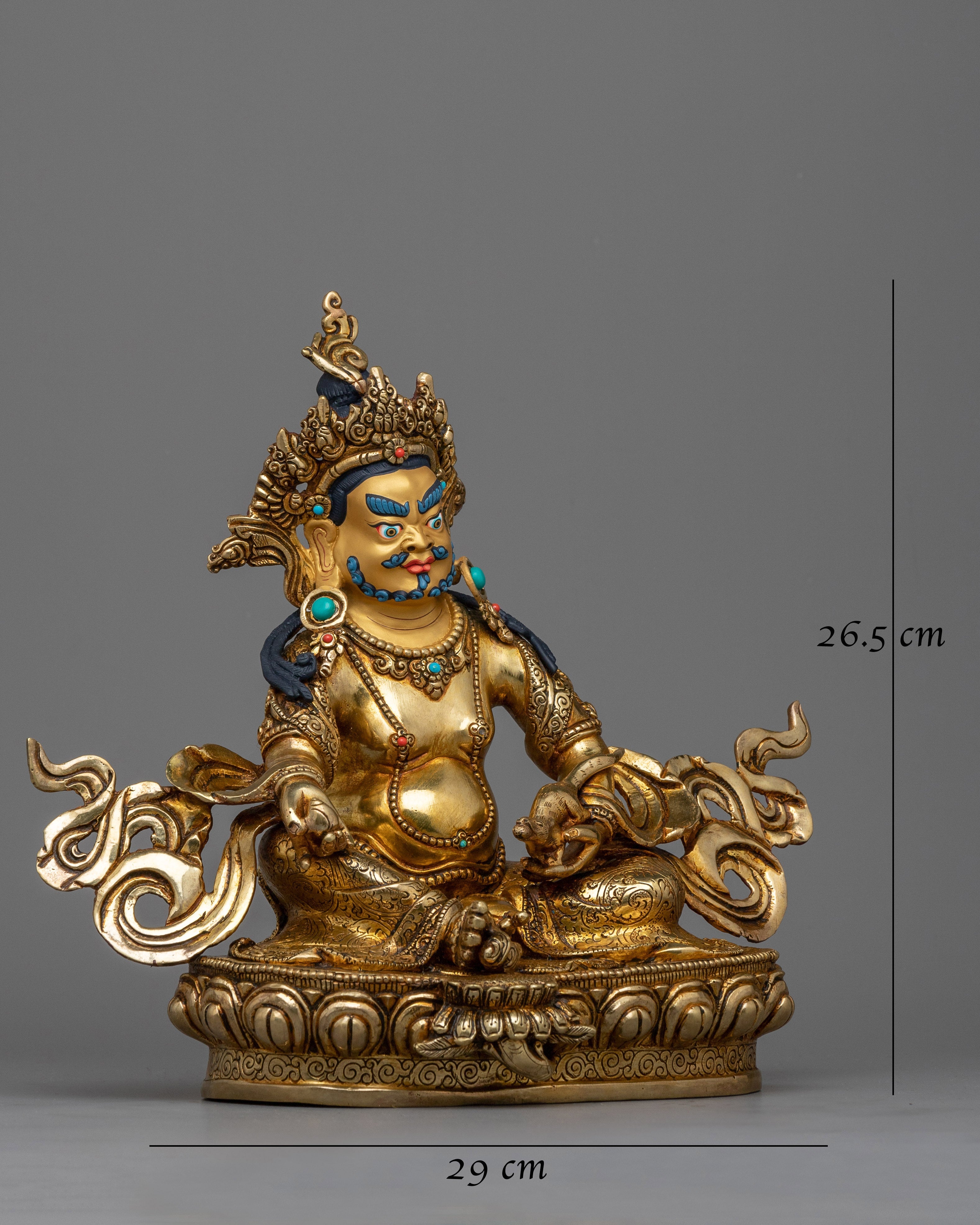 Introducing our "Gold Gilded Dzambhala Jewels" statue, an attractive representation of the deity of wealth and success. Standing 10.4 inches tall and weighing 2.92 kg, this statue is made of sturdy copper and gilded with 24K gold. The gold and acrylic paintings, accompanied by hand-carved diamonds, show the detailed features of Dzambhala's countenance, regal posture, and the symbolic jewels he clutches, which represent riches and success.