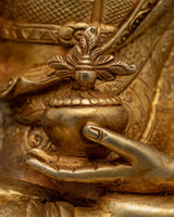 This traditional Medicine Buddha Healing Statue is a marvel of exceptional Himalayan creativity, meticulously created in our workshop. The statue's shine and brilliance come from the gold gilding that covers its copper body. The Buddha is shown sitting on a moon disc lotus on an ornately designed throne with numerous patterns and embellishments. He carries a flower vase in his right hand while holding a myrobalan plant in his left hand. The Buddha's face is highlighted with acrylic colors.