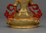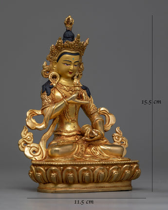 This lovely statue has a copper body that has been skillfully crafted and is gilded in 24K gold. Gold and acrylic paintings accentuate the fine features of Vajrasattva's countenance and the elaborate patterns on his attire, giving the picture more depth and vitality. Its substantial presence and weight of 0.564 kg make it perfect for any area used for spiritual development, meditation, or introspection.