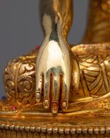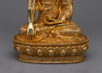Introducing our stunning Gold-Gilded Shakyamuni Buddha Sculpture, handcrafted in the renowned workshops of Patan, Nepal. This statue stands 31.5cm (12.4 inches) tall and has a hefty 21cm (8.3 inch) base. It embodies the tranquility and wisdom of Shakyamuni Buddha, the historical founder of Buddhism, as seen in a moment of meditative grace.
