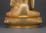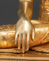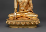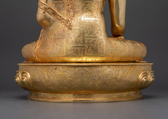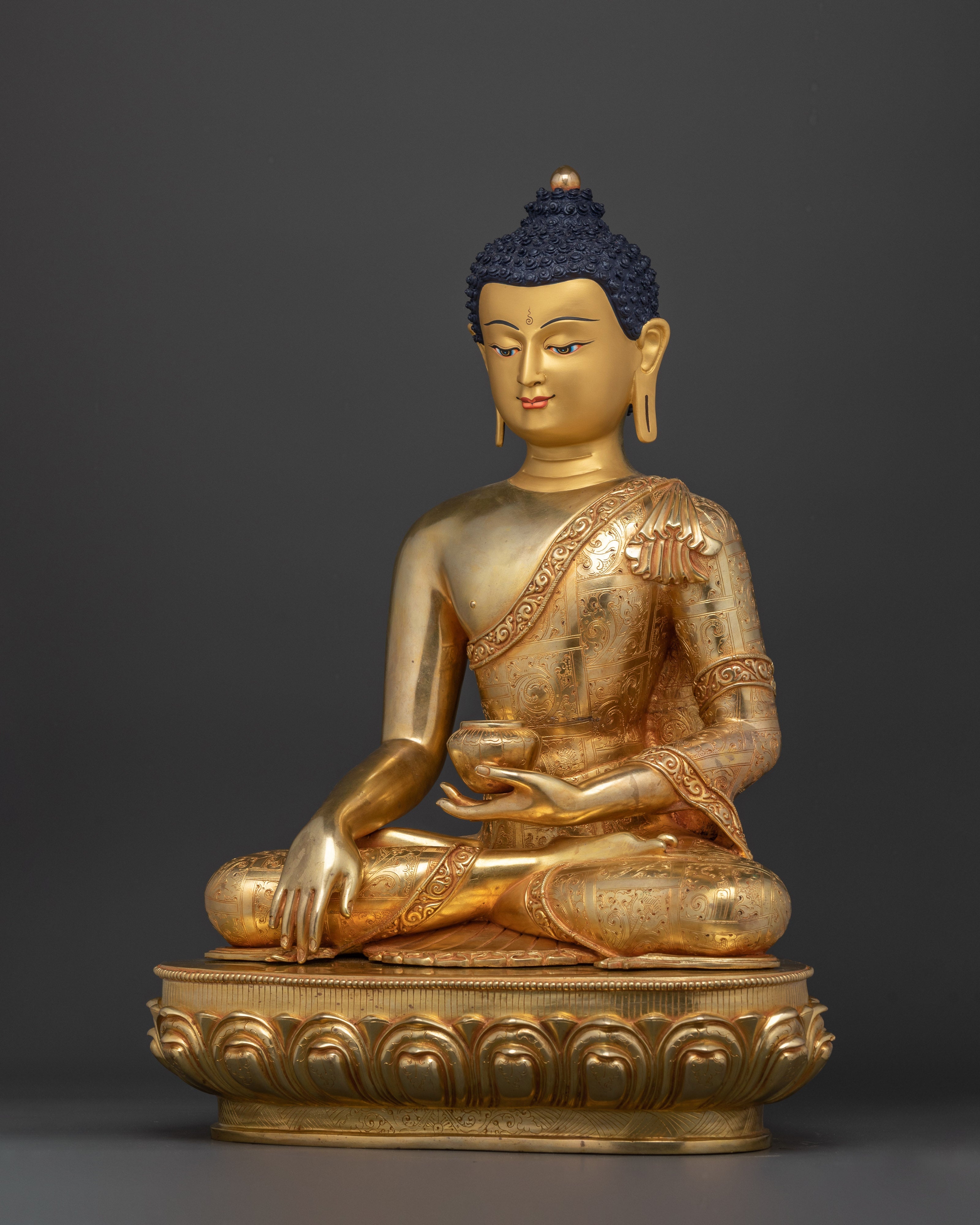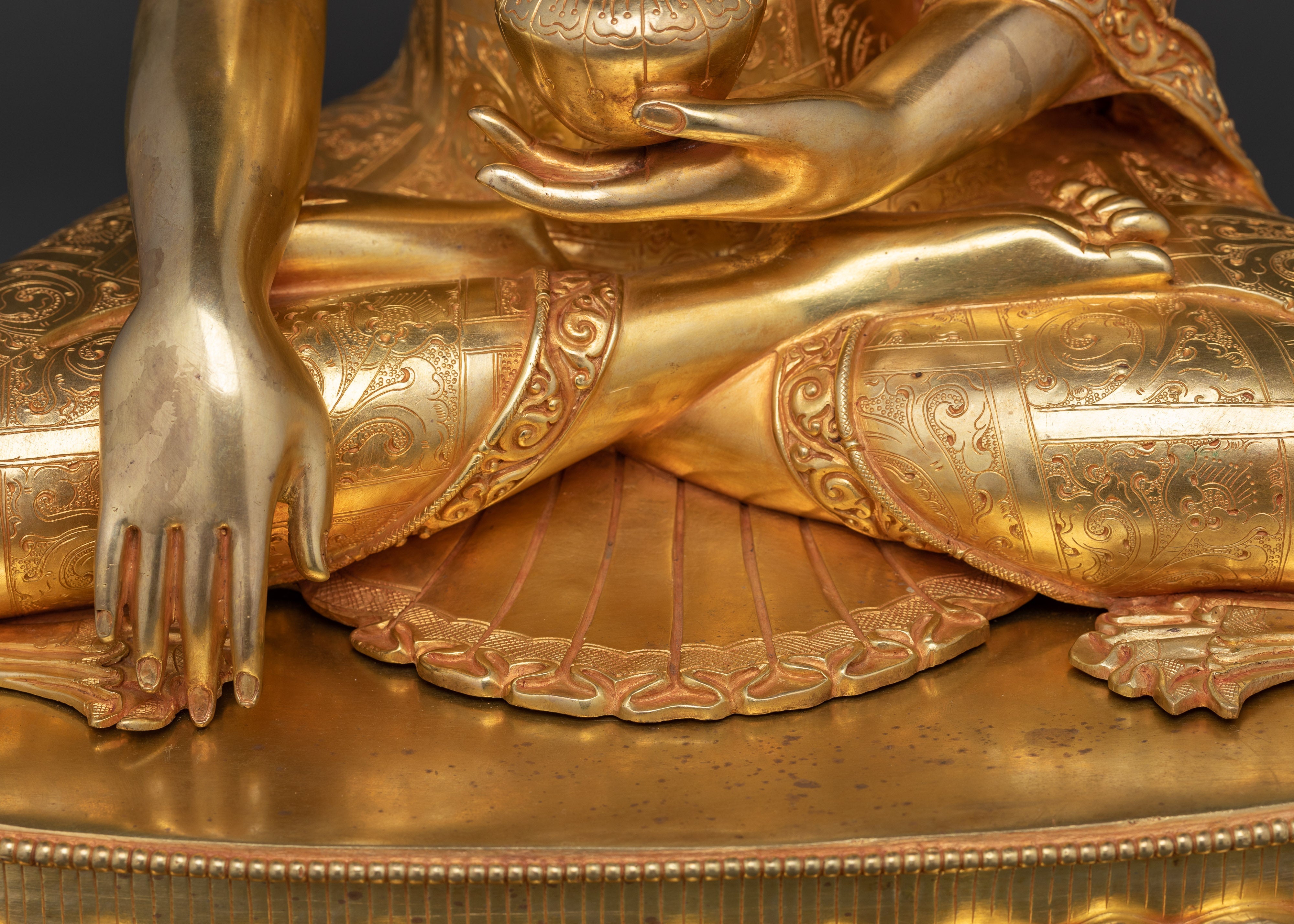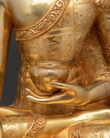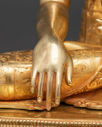 Standing at an impressive height of 18.7 inches, this Gold gilded Shakyamuni Buddha statue is Beautiful gilded with 24K gold, imparting a luminous, sacred glow that enhances the ambiance of any environment. The Buddha is depicted in a serene meditation pose, embodying the profound inner peace and enlightenment that defines his spiritual essence. His right hand is rested on his knee while his fingers are touching the ground. Also, his left hand is rested on his lap with an alms bowl.