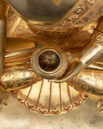 Handcrafted by skilled artisans in Patan, Nepal, The detailed artistry is further enhanced with delicate gold and acrylic paintings, which highlight the intricate features of the Buddha’s face, the flowing lines of his robes, and the symbolic elements he holds. This meticulous craftsmanship not only adds to the statue’s visual splendor but also imbues it with spiritual significance.