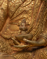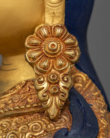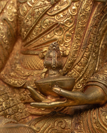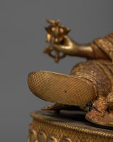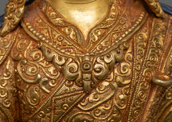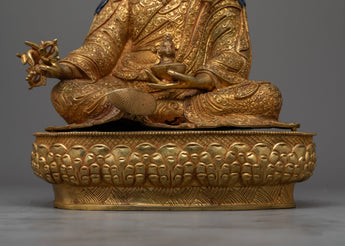 The intricate patterns on Guru Rinpoche's robes, as well as the precise facial features that represent his calm yet authoritative personality, demonstrate the statue's artistry. The use of 24K gold gilding emphasizes the statue's sumptuous finish, making it a standout item in any environment. This statue is ideal for meditation rooms, spiritual centers, or as a focal point in any home. It serves as a powerful reminder of Guru Rinpoche's teachings and his role in protecting the Dharma.