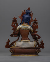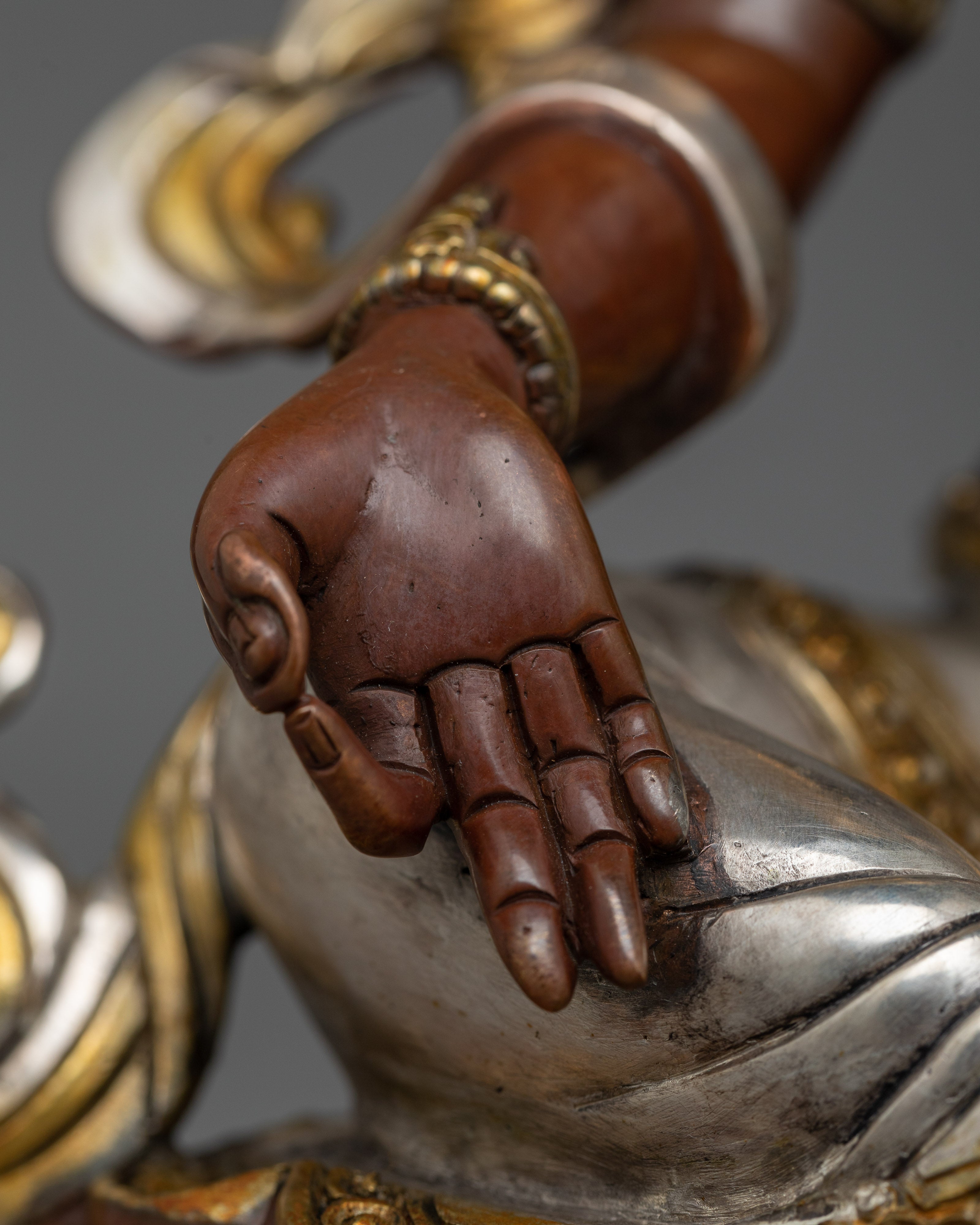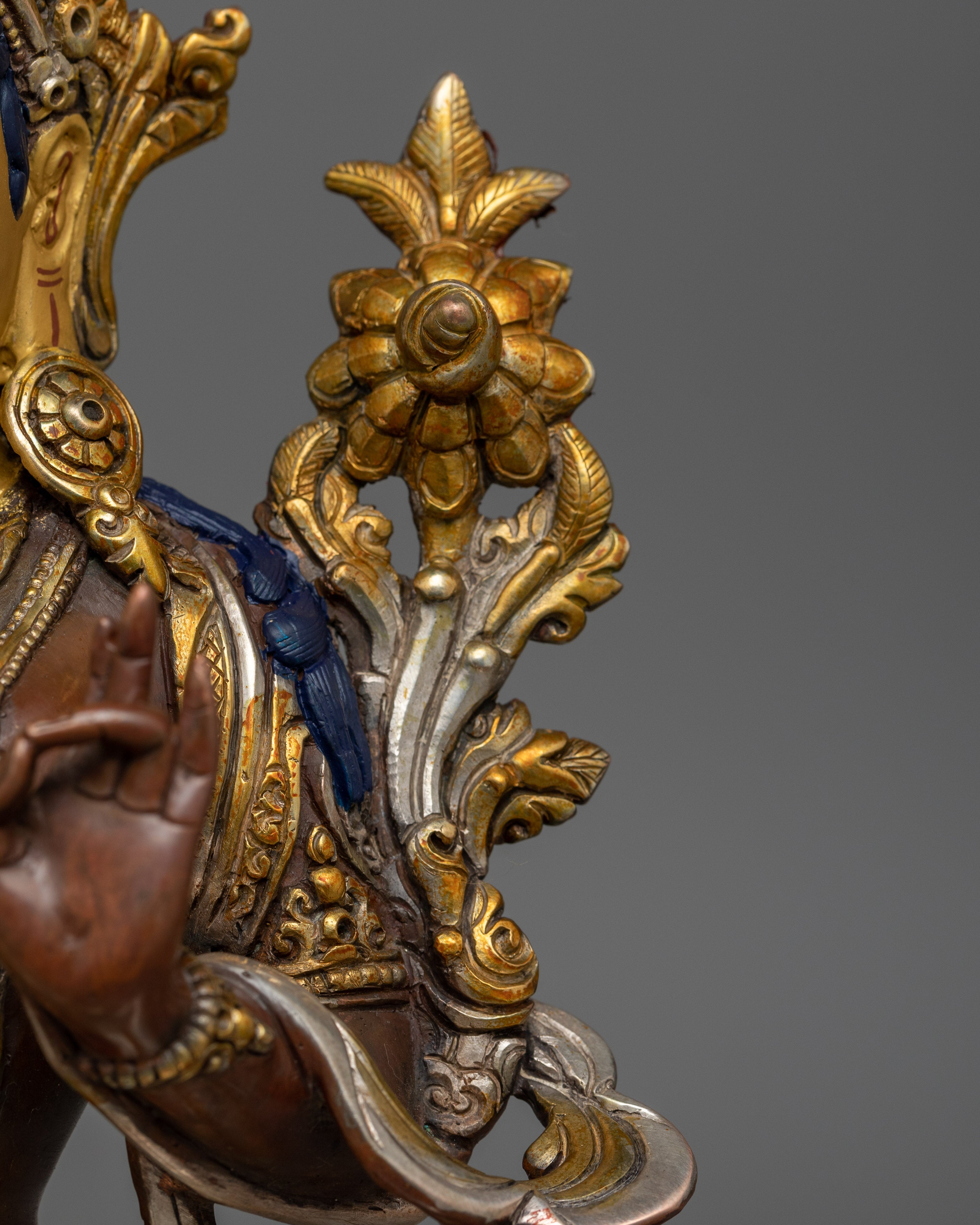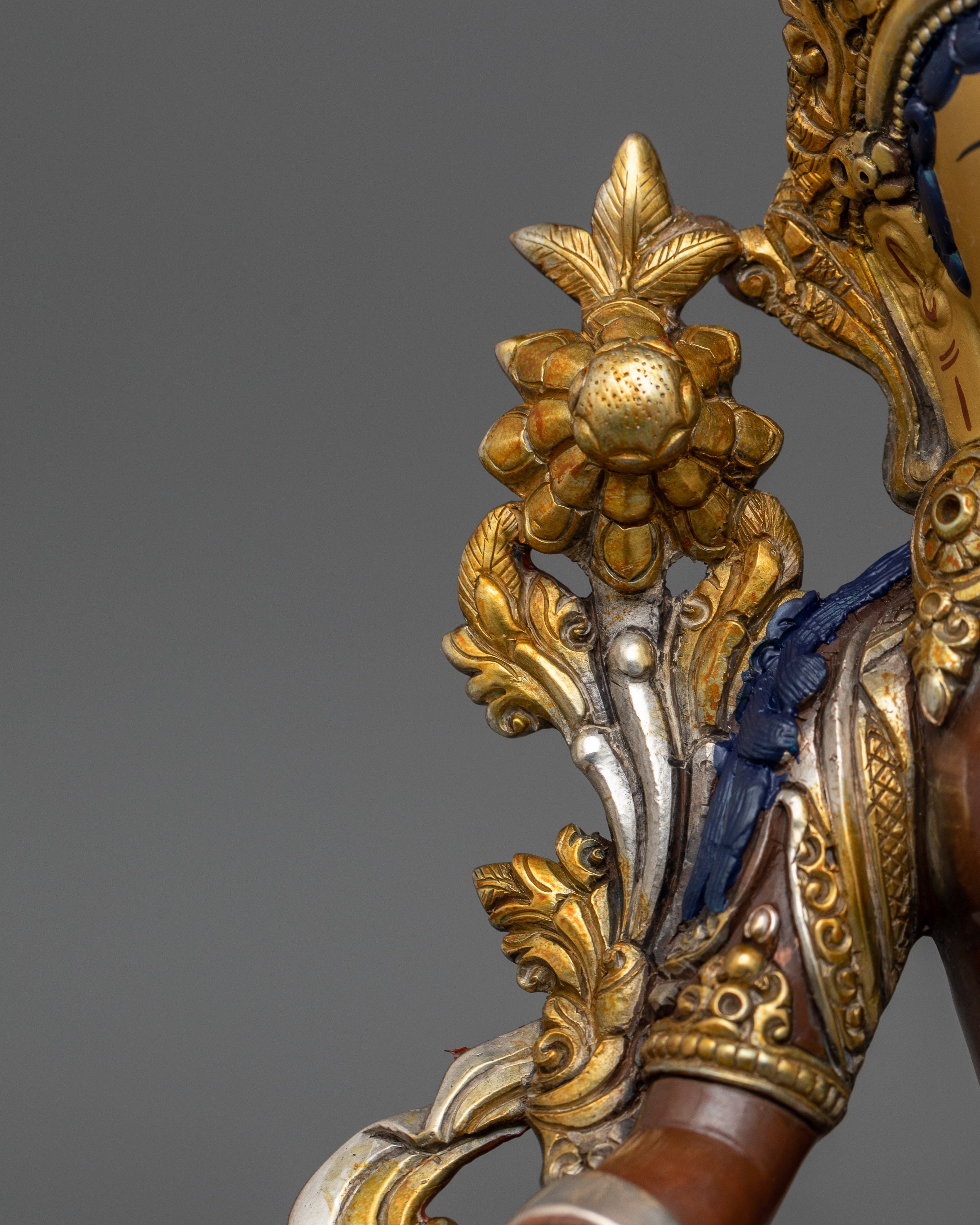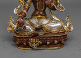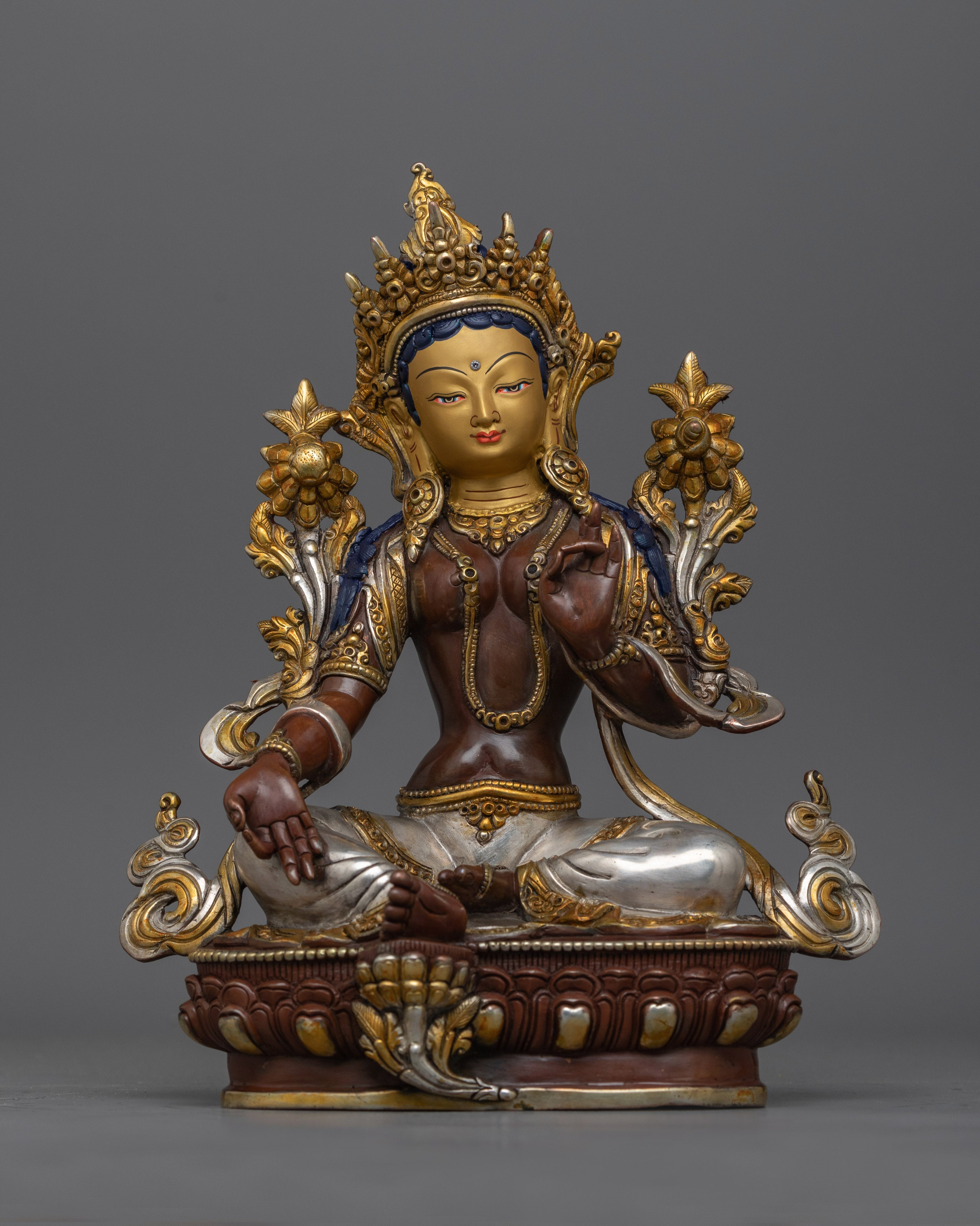 Weighing 1.17 kg, this statue combines the lightness of its size with the stability required in a sacred figure, making it ideal for personal altars or as the centerpiece of a collection. The mix of silver and gold with the underlying oxidized copper creates depth and a multidimensional appeal, expressing Green Tara's dual nature as a gentle nurturer and a forceful protector.