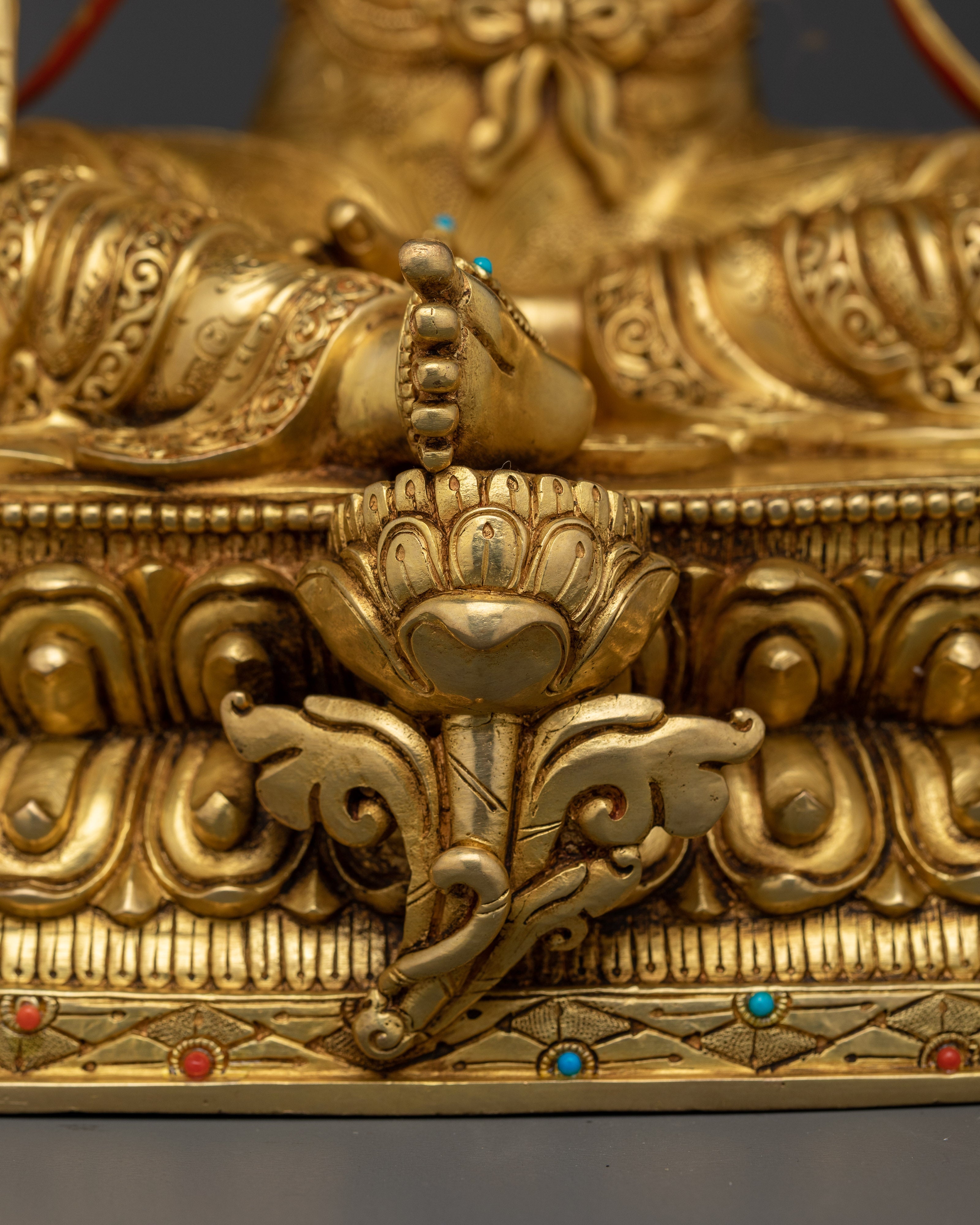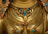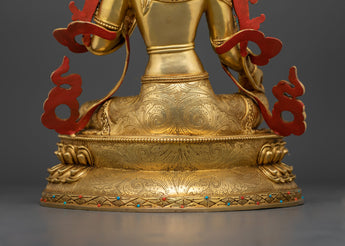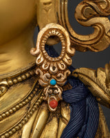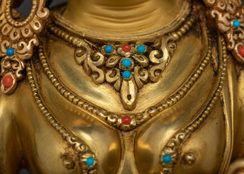 Green Tara Buddha Goddess statue is a masterfully constructed work of art made of high-quality copper and gilded with 24K gold, embellished with gold and acrylic paintings, and set with magnificent gemstones. Green Tara is the epitome of kindness and quick action, always willing to assist anyone in need. She is seated in a graceful posture, her right leg extended, representing her readiness to take action to alleviate suffering.