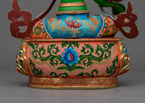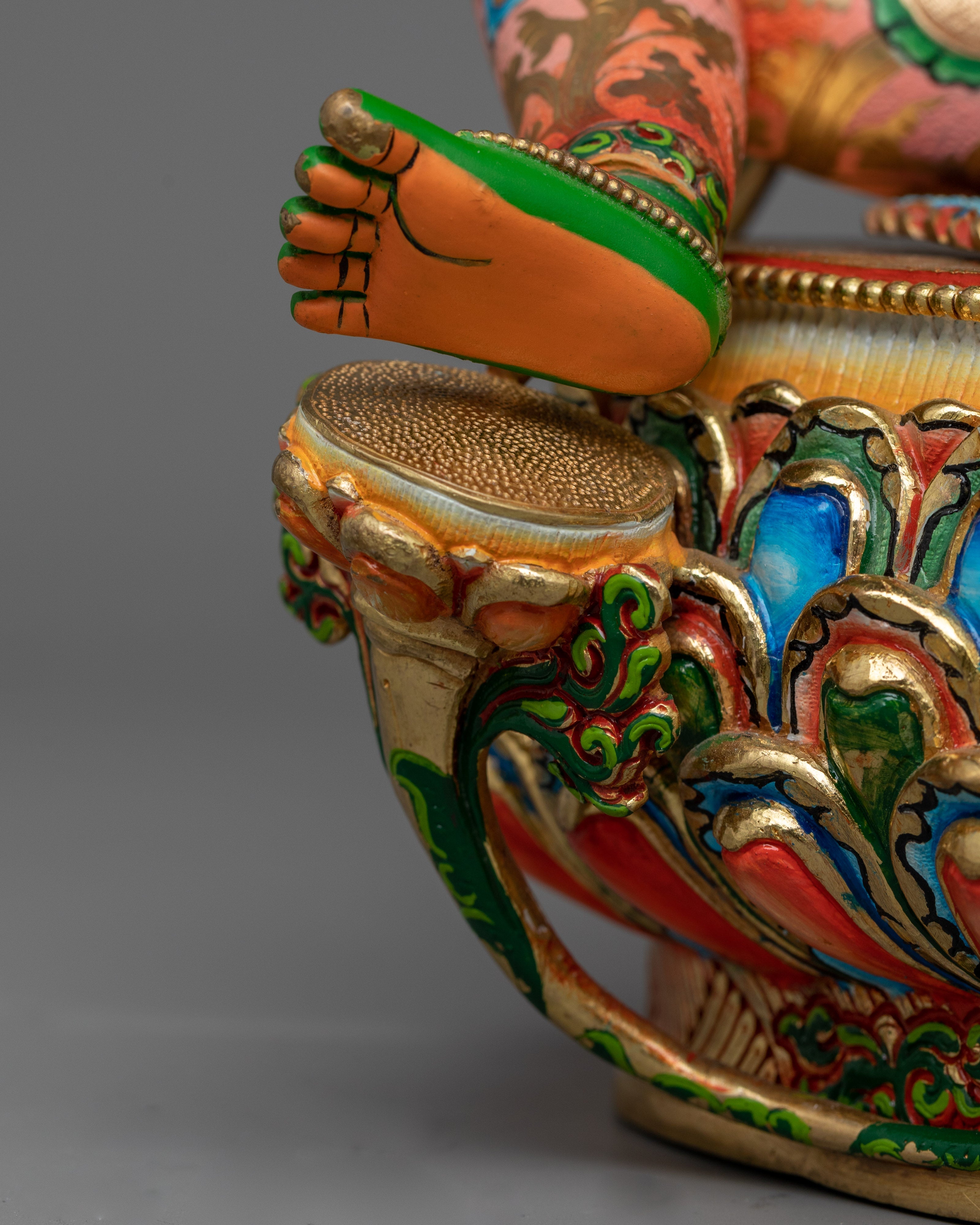 The Green Tara figure is adorned with beautiful colors and elaborate 24K gold gilding. She radiates a celestial radiance that represents the transformational power of healing and compassion. With her copper body acting as a conduit for divine gifts, she embodies the enlightened ones' caring presence, helping people to emancipation and inner peace.