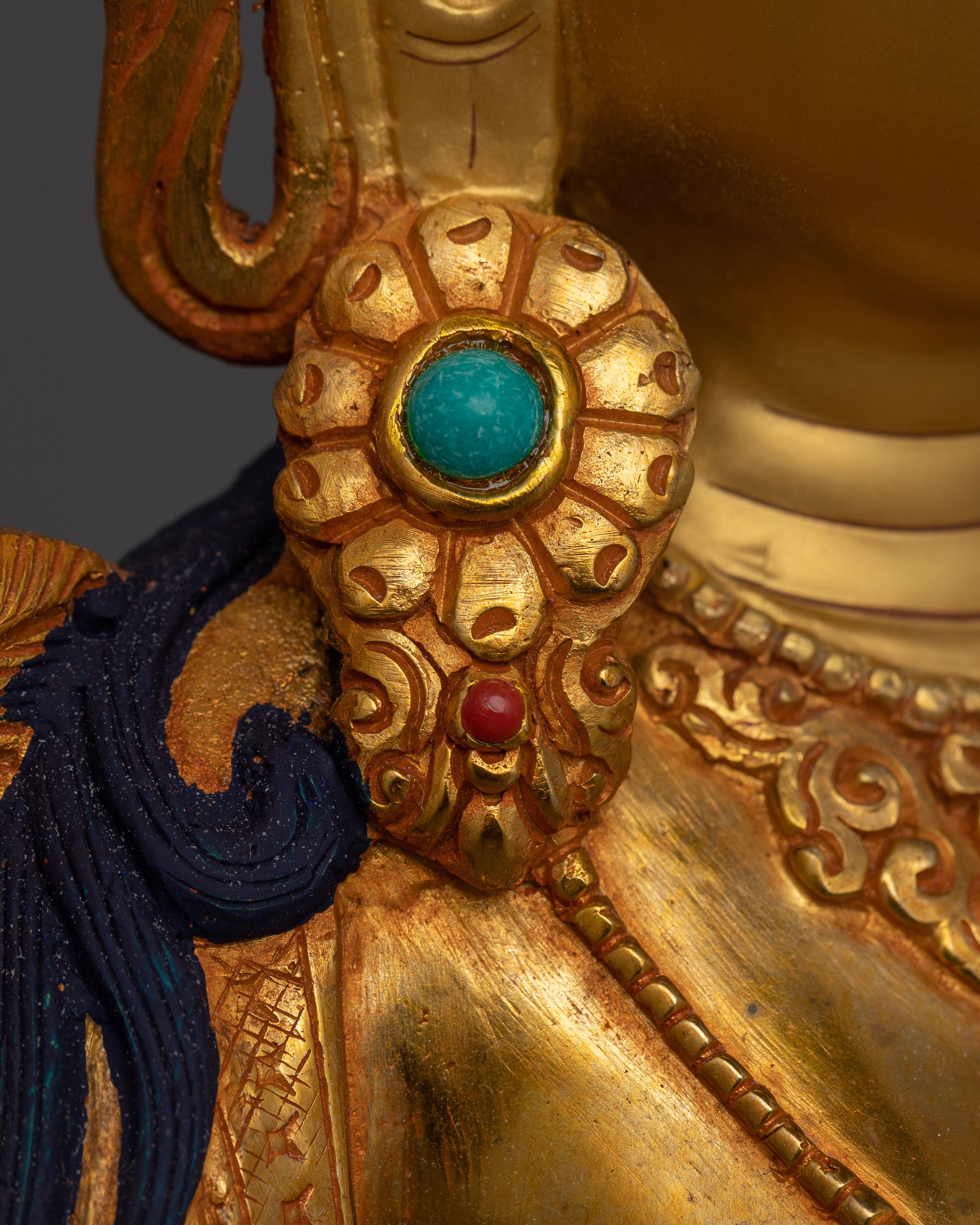 This 33-cm-tall Green Tara Compassionate Bodhisattva Sculpture is made of copper and embellished with jewels, acrylic 24K gold gilding, and gold paint. Her serene expression symbolizes life, action, and her persistent commitment to helping all sentient beings. She represents preparedness while sitting in Lalitasana, a loose pose with one leg outstretched, ready to respond when assistance is needed. Her awakened character is highlighted by the lotus flowers she holds, which stand for purity and the flower of compassion.
