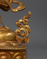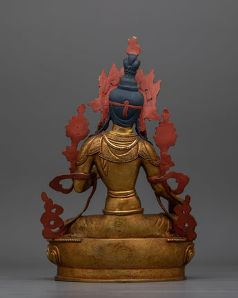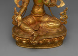This gorgeous statue has a brilliant and divine aspect due to its skillful construction from a copper body and 24K gold plating. Vibrant gold and acrylic paintings accentuate the fine details of Green Tara's expression and the elaborate patterns on her attire, giving the visual more depth and vitality. The statue has an ageless appeal because of its antique-inspired polish. Her crown and jewelry are adorned with intricately crafted gemstones that accentuate her divine beauty and represent her spiritual significance. Its substantial presence and weight of 4.54 kg make it perfect for any area used for spiritual development, meditation, or introspection.