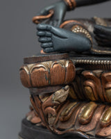 The Green Tara Guru Sculpture is hand-made with a copper body with a gold gilded finish over various parts of the body and painted with acrylic paint to highlight the detail patterns. In order to assist anyone in need, Green Tara is seated on a lotus seat flower with her right leg extended. Her left hand is holding a lotus stem, and her right hand is in the bestowing mudra with a finger on the stem. The body ornaments and headdress are carved with a flawless design that has been embedded with numerous jewel stones. The statue took our artists months of hard work to craft with carving patterns that are exclusive to Nepal.