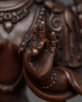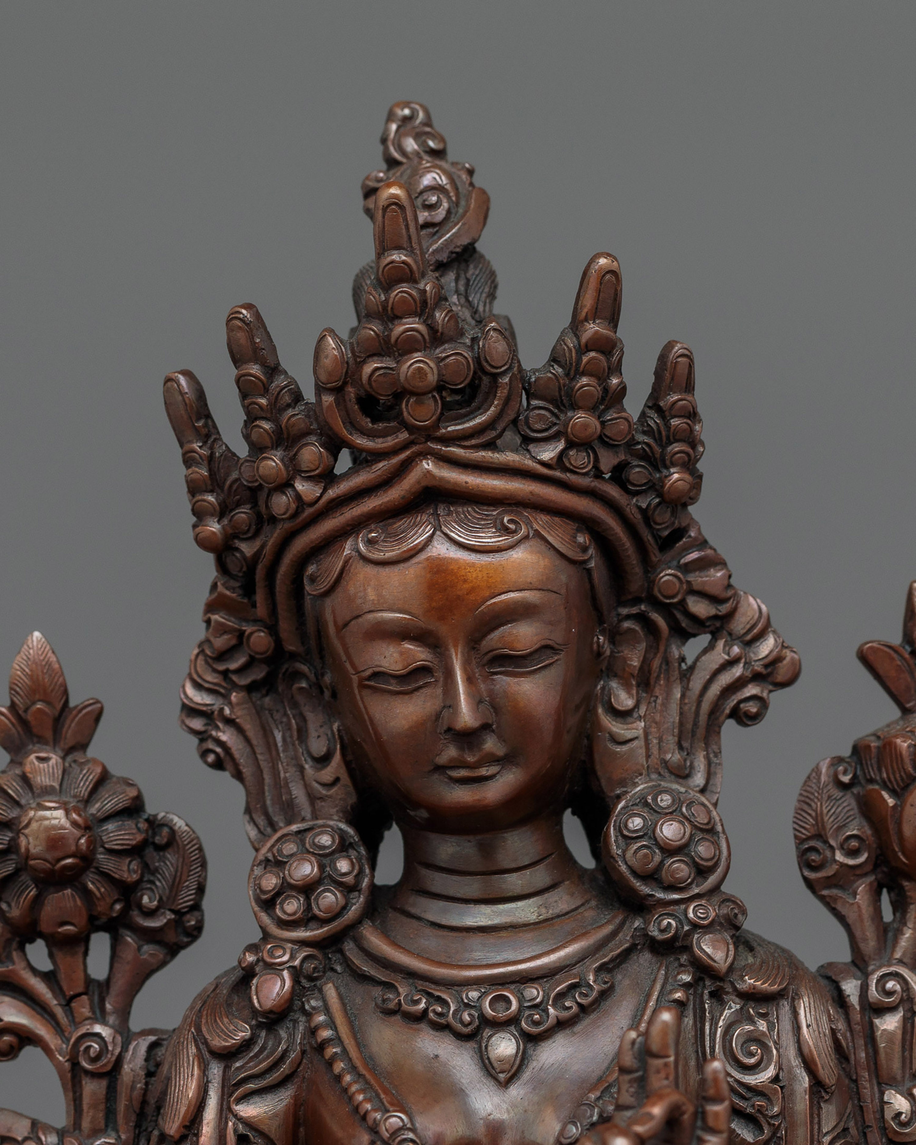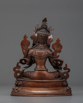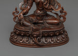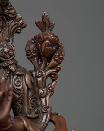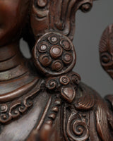 Introducing our Green Tara Handmade Small Oxidized statue, which was skillfully handmade in Patan, Nepal. Crafted from finest oxidized copper, this amazing object perfectly captures the rich legacy of Nepalese metalwork. Green Tara, who represents protection and compassion, is portrayed in a calm and commanding pose, signifying her function in removing barriers and providing comfort from worries. The statue's oxidized finish and intricate features showcase our artists' amazing skills and give it a timeless spiritual depth.
